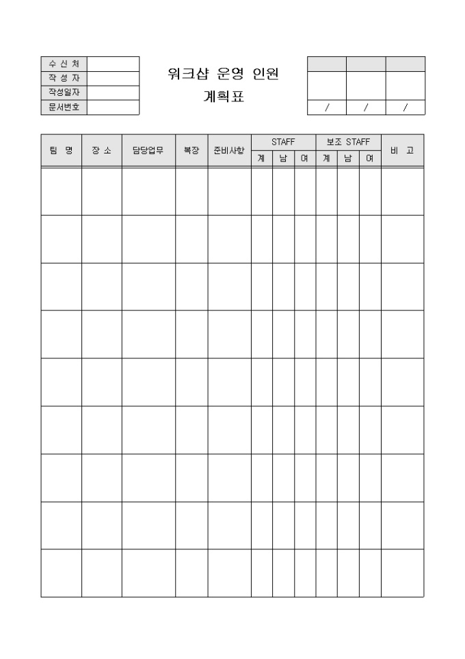 9,000원/월워크샵 운영 인원 계획 수립 시 사용할 수 있는 워크샵 운영 인원 계획표입니다. 팀명, 장소, 담당업무, 복장, 준비사항 등의 항목으로 구성되어있습니다.