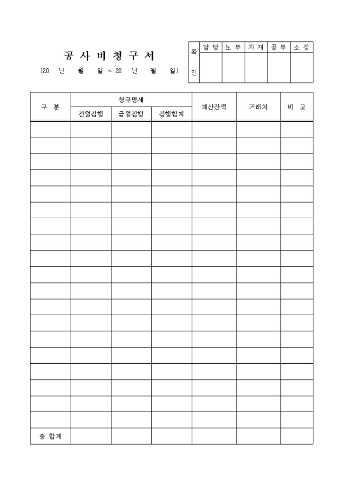 공사비청구서입니다. 전월집행, 금월집행, 집행합계의 청구명세와 예산잔액, 거래처를 입력할 수 있는 서식입니다.
