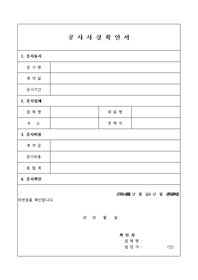 9,000원/월표 형식으로 작성된 공사사실확인서입니다. 공사표기, 공사업체, 공사비용, 공사 내용의 항목으로 구성되어있습니다.