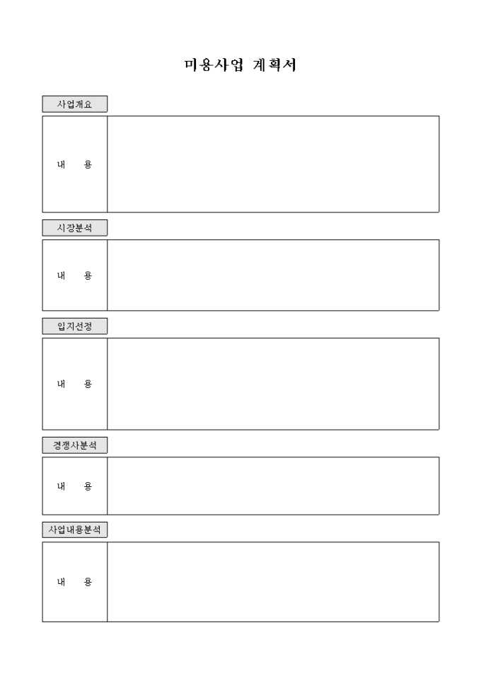 9,000원/월미용사업을 계획하시는 분들을 위한 계획서로써 사업개요 및 시장구조 등의 양식이 들어있는 서식입니다.