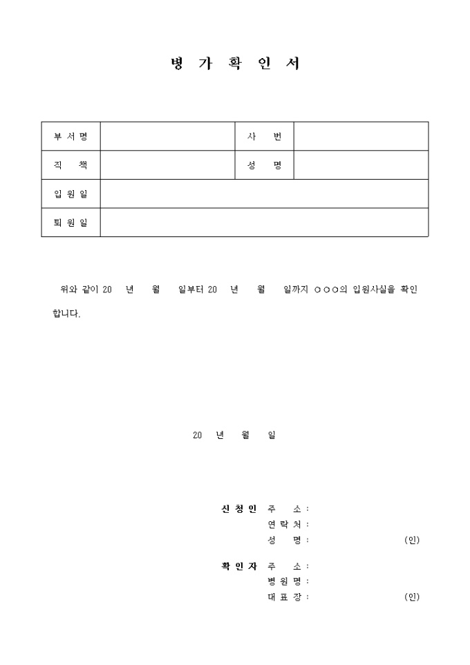 부서명, 사번, 직책, 성명, 입원일, 퇴원일 등의 항목으로 구성되어 입원사실을 확인할 수 있는 내용의 병가확인서입니다.