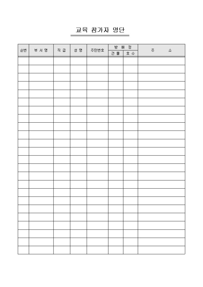 9,000원/월사내 교육 참가인원의 명단을 기록/ 관리할 수 있는 교육 참가자 명단입니다. 순번, 부서명, 직급, 성명, 주민번호 등의 항목으로 구성되어있습니다.