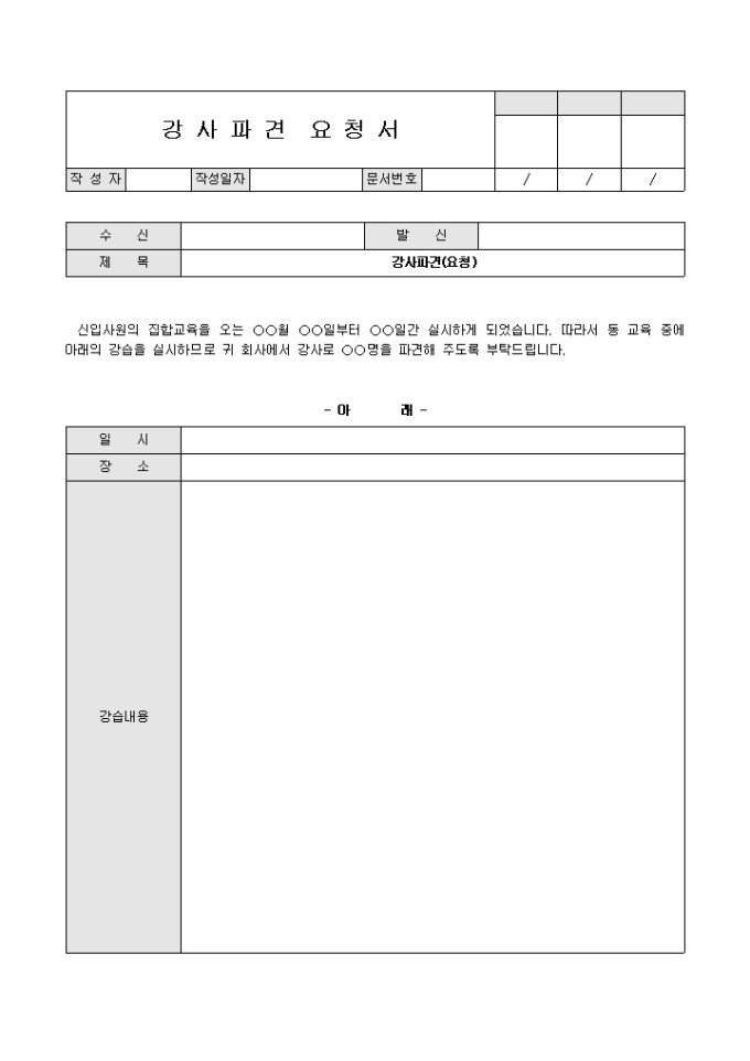 신입사원의 교육실시에 따른 강습강사의 파견을 부탁할 때 작성하여 제출하는 강사파견 요청서입니다.
