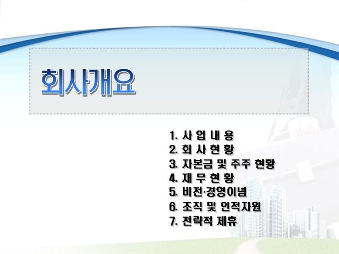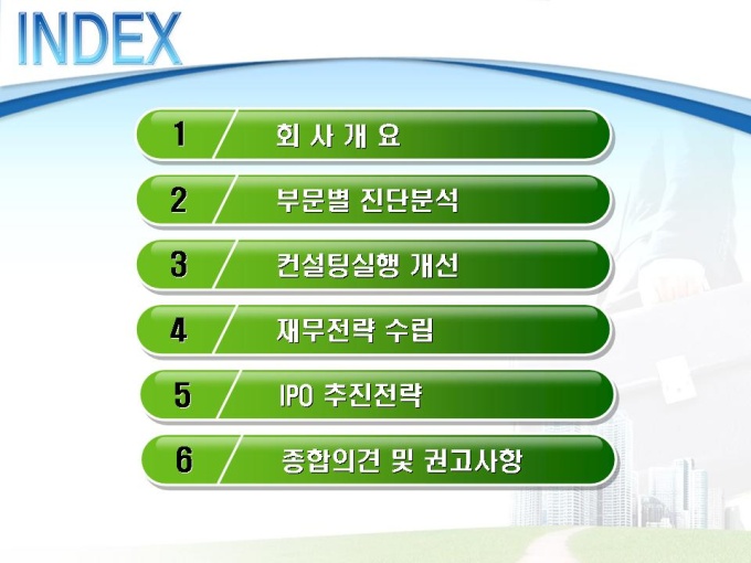 기술엔지니어 업체 관련 경영컨설팅 보고서입니다. 1. 회 사 개 요 2. 부문별 진단개요 3. 컨설팅실행 개선 4. 재무전략 수립 5. IPO 추진전략 6. 종합의견 및 권고사항