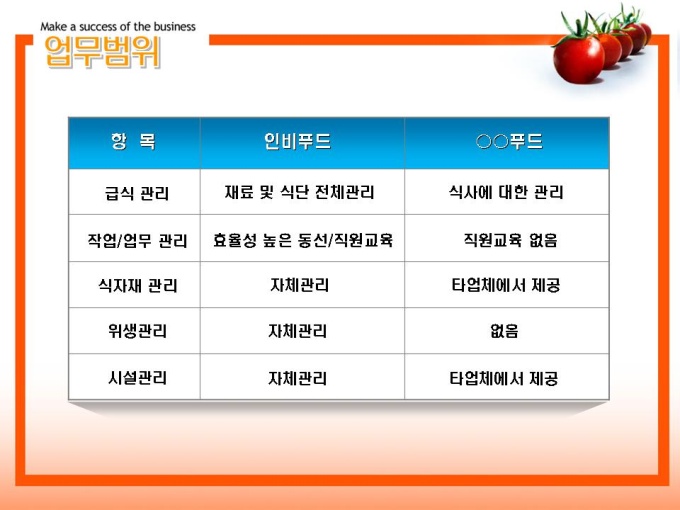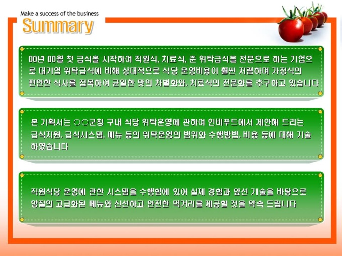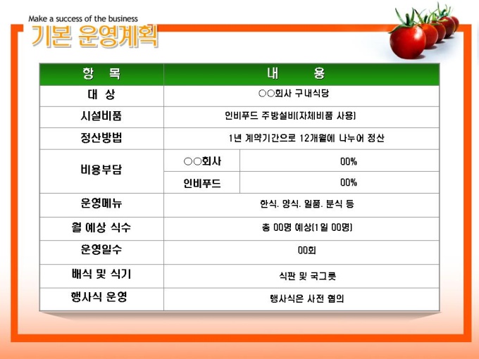 본 기획서는 ○○회사 구내 식당 위탁운영에 관하여 인비푸드에서 제안해 드리는 급식지원, 급식시스템, 메뉴 등의 위탁운영의 범위와 수행방법, 비용 등에 대해 기술하였습니다