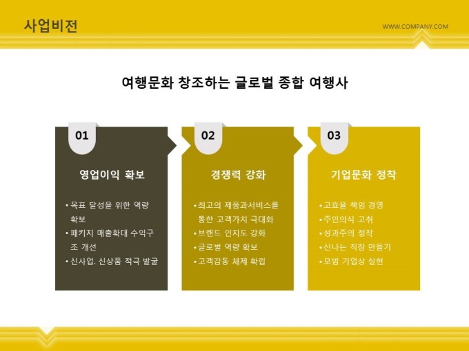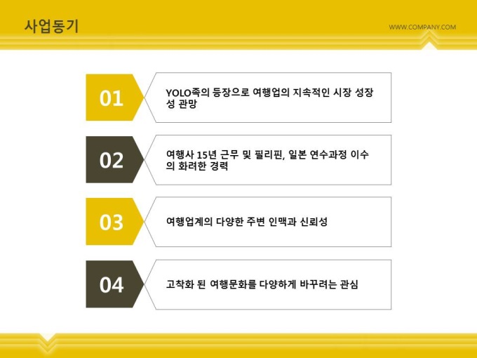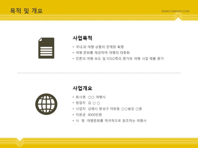 사업목적 - 국내.외 여행 상품의 판매망 확충 - 여행문화를 제공하는 여행사라는 브랜드화 사업개요 - 회사명: 인비 여행사 - 창업자: 홍길동 - 사업지: ○○시 ○○구 ○○동 인비빌딩 1층 - 자본금: 00만원 - 사 명: 여행문화를 창조하고 발전시키는 글로벌 여행사