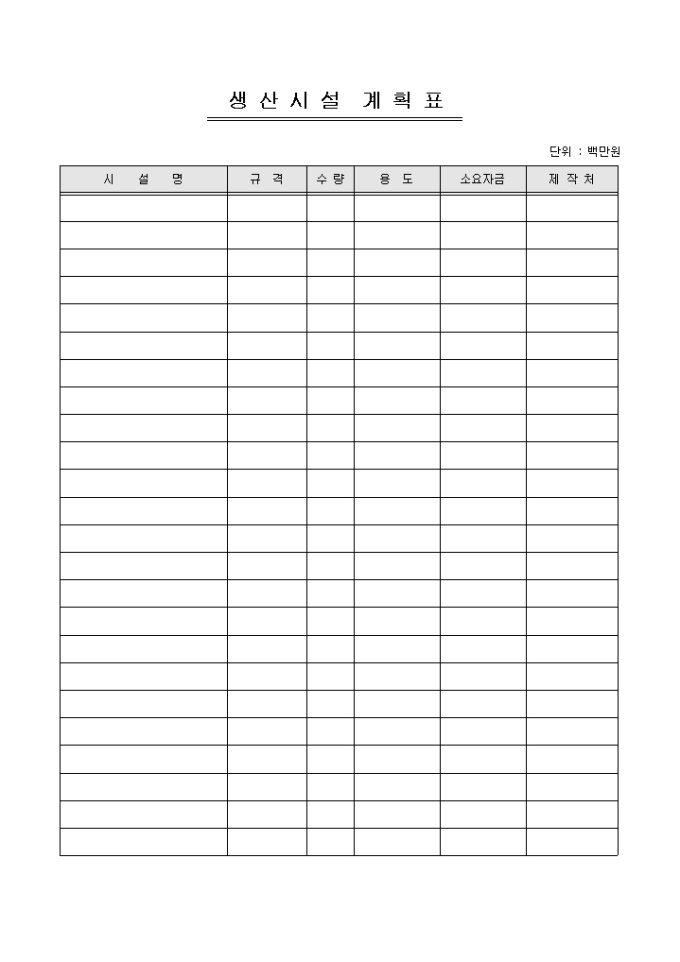 생산시설에 관한 계획 수립 시 사용할 수 있는 생산시설 계획표입니다. 시설명, 규격, 수량, 용도 등의 항목으로 구성되어있습니다.