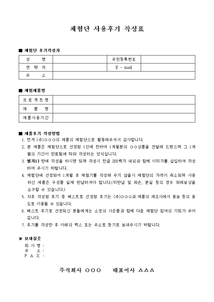 9,000원/월식품관련 체험단으로 선정되어 정해져있는 기간동안 체험 후 사용후기를 작성할 수 있는 서식으로 제품후기 작성방법을 포함하고있는 체험단 사용후기 작성표입니다.
