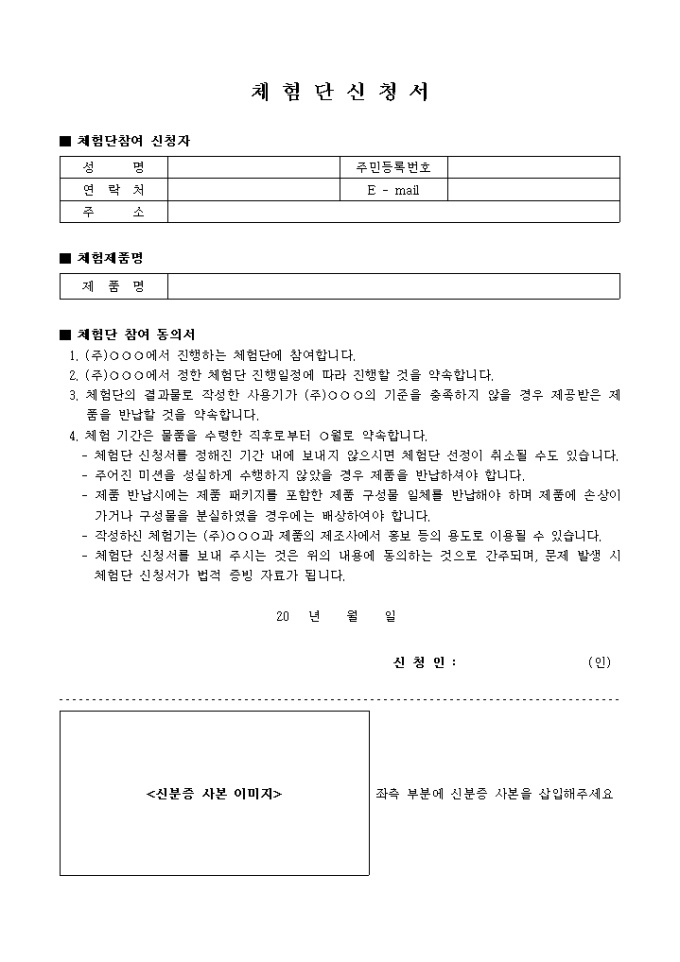 제품 체험단으로 신청을 원할때 사용할수 있는 서식으로 체험단에 참여할 경우에 대한 동의서를 포함하고 있는 체험단 신청서입니다.