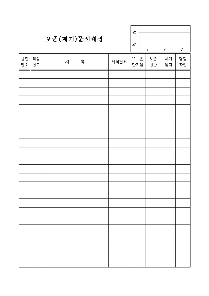 일련번호,작성년도,제목,위치번호,보존만기일,보존년한,폐기일자를 기록하는 보존,폐기문서대장입니다.