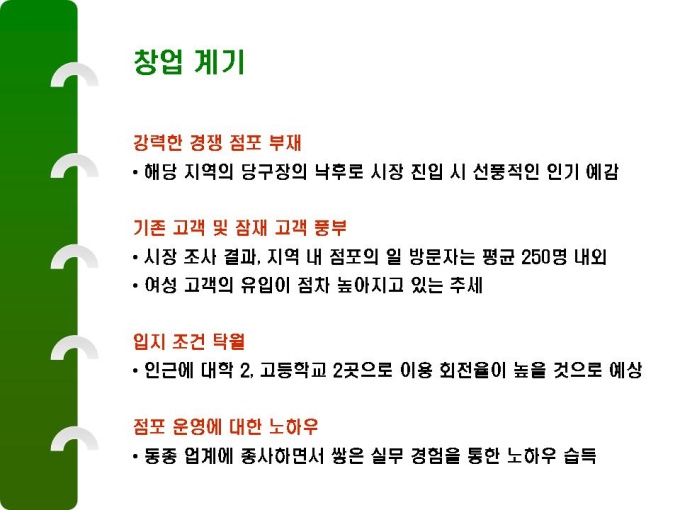 1.창업 계기 2.시장 상황 3.경쟁사 분석 4.자금 조달