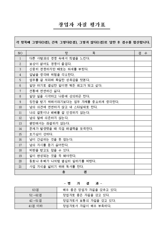 9,000원/월창업자의 자질을 테스트할 수 있는 창업자 자질 평가표입니다. 21개의 질문내용을 포함하고 있습니다.