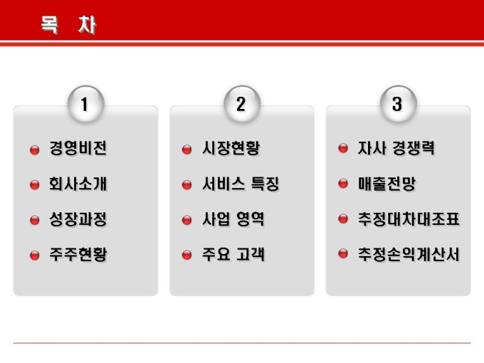 목차는 크게 회사소개, 사업소개, 재무계획의 내용으로 구성되어있습니다.