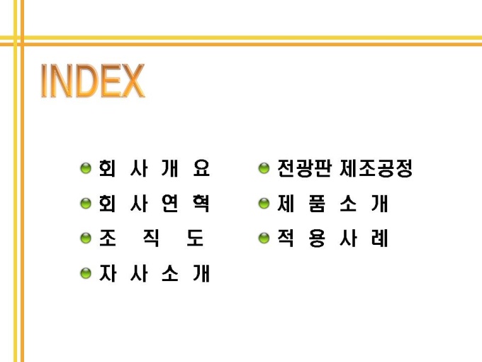 목차는 1.회사개요 2.회사연혁 3.조직도 4.자사소개 5.전광판 제조공정 6.제품소개으로 구성되어있습니다.