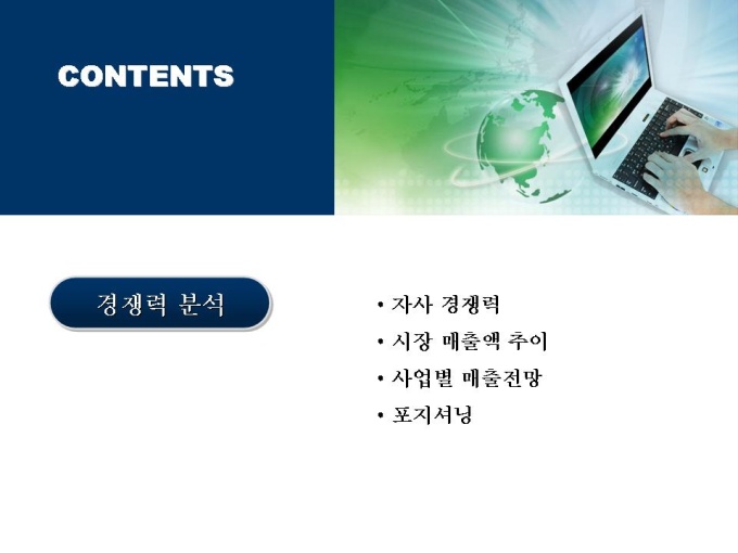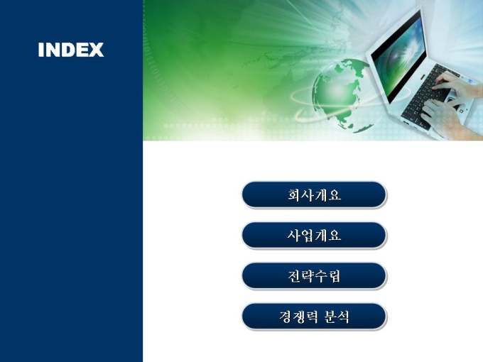 목차는 1.회사개요 2.사업개요 3.전략수립 4.경쟁력분석으로 이루어져있습니다.