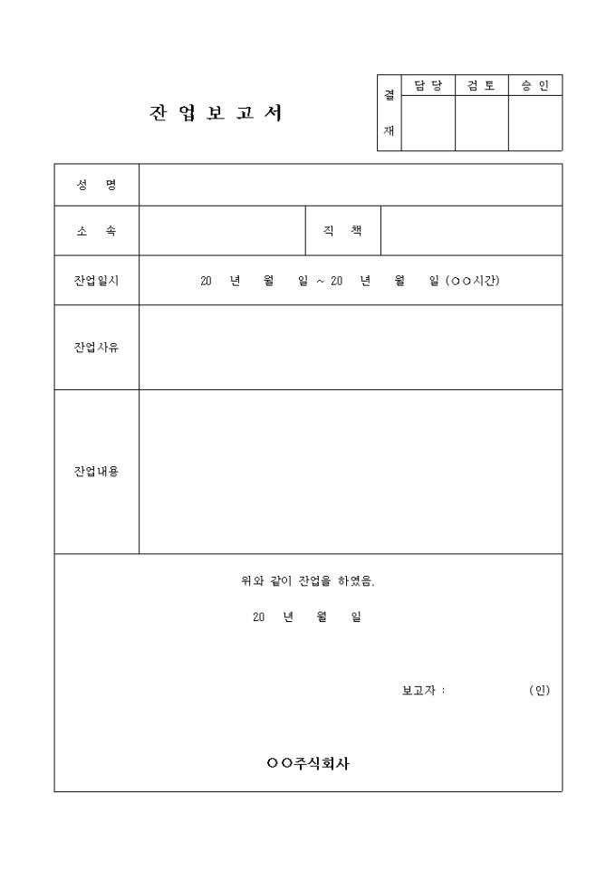 9,000원/월잔업보고서입니다. 근무자의 인적사항과 잔업내역으로 구성되어 있고 결재란이 따로 표기되어있는 서식입니다.