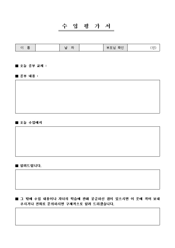 9,000원/월학원 학생의 수업에 관해 교사가 평가하고 가정에 알릴 수 있는 형식의 수업평가서입니다. 오늘 공부 교재, 공부 내용, 오늘 수업에서 등 5개의 항목으로 구성되어있습니다.