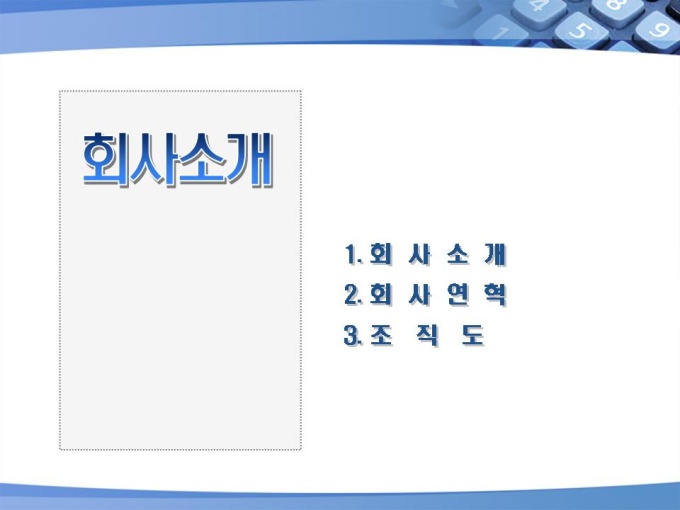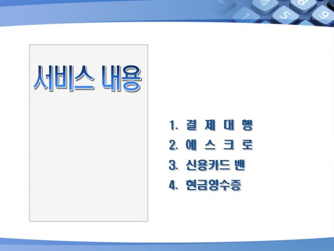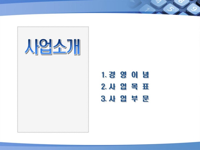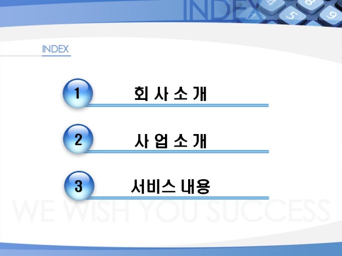 목차는 1.회사소개 2.사업소개 3.서비스내용으로 구성되어 있습니다.