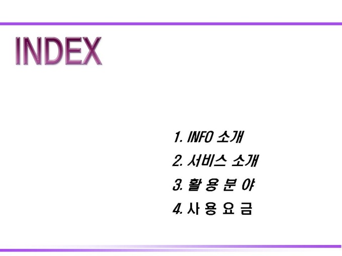 목차는 1.회사소개 2.서비스 소개 3.활용분야 4.사용요금로 구성되어있습니다.