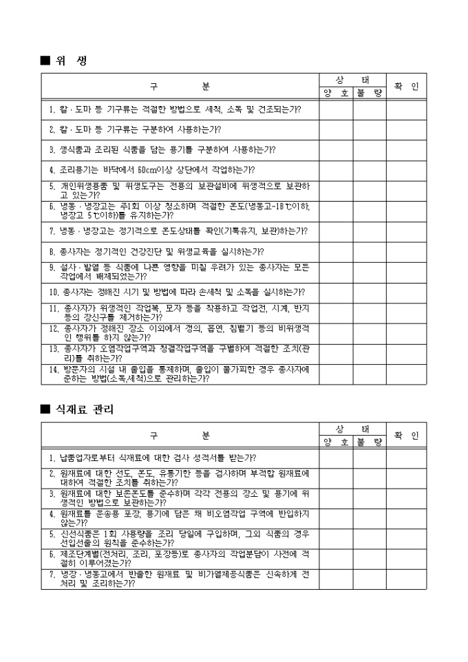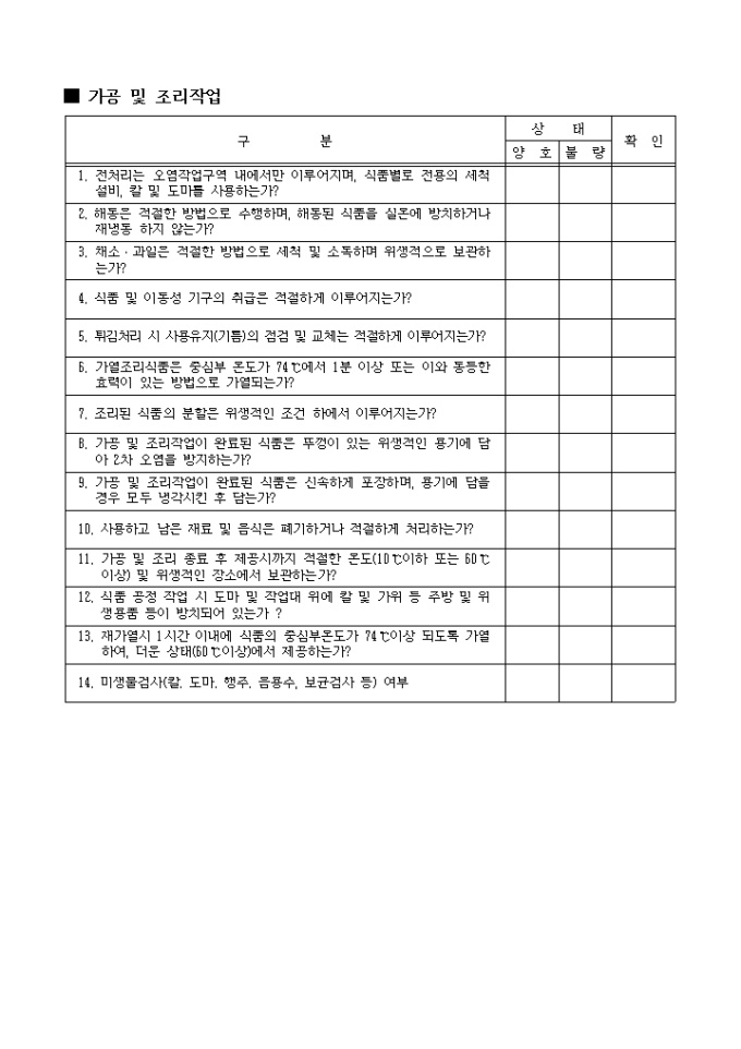 식자재 위생관리에 대한 점검표입니다. 시설설비, 위생, 식재료 관리, 가공 및 조리작업에 대한 항목으로 구성되어있는 식자재 위생관리 점검표입니다.