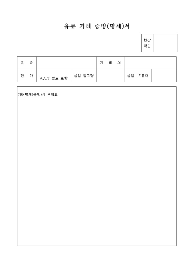 9,000원/월유종,거래처,단가,금일 입고량,금일 유류대,거래명세서 부착요란으로 구성된 유류거래증빙,명세서입니다.