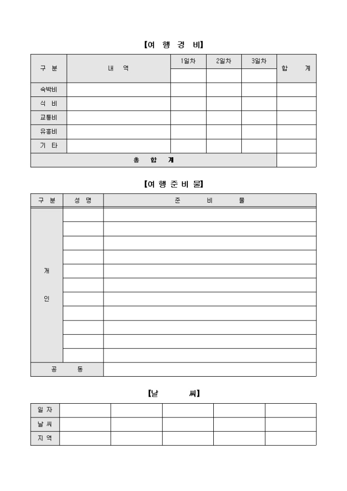 휴가계획을 상세히 기록/ 보고할 때 사용할 수 있는 휴가계획서입니다. 휴가기간, 여행기간, 동행자, 여행일정, 여행경비, 여행준비물 등의 항목으로 구성되어있습니다.