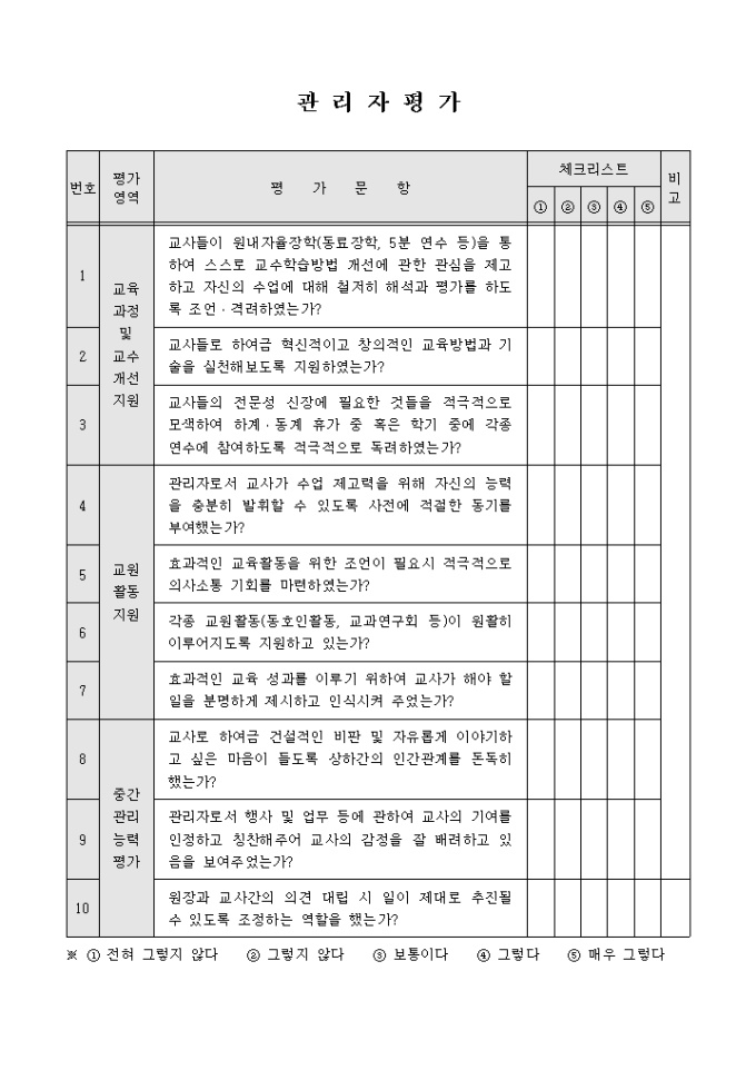 9,000원/월학원 관리자에 관한 상향평가 시 사용할 수 있는 원장 관리자평가서입니다. 평가영역, 평가문항, 체크리스트, 비고 등의 항목으로 구성되어있습니다.