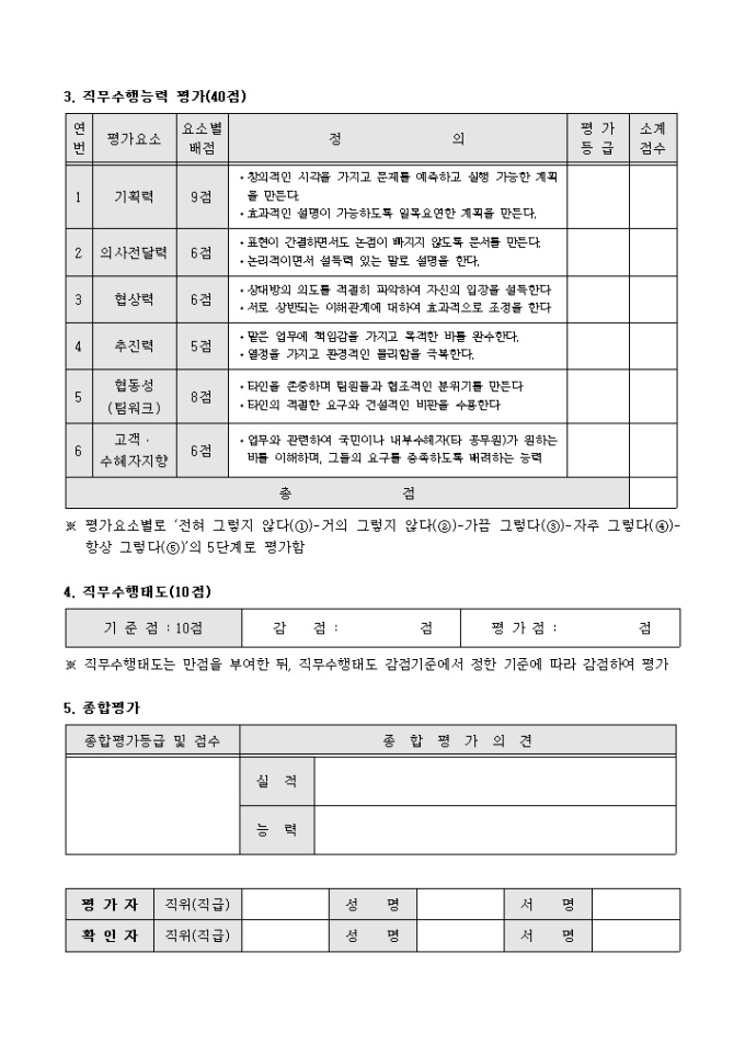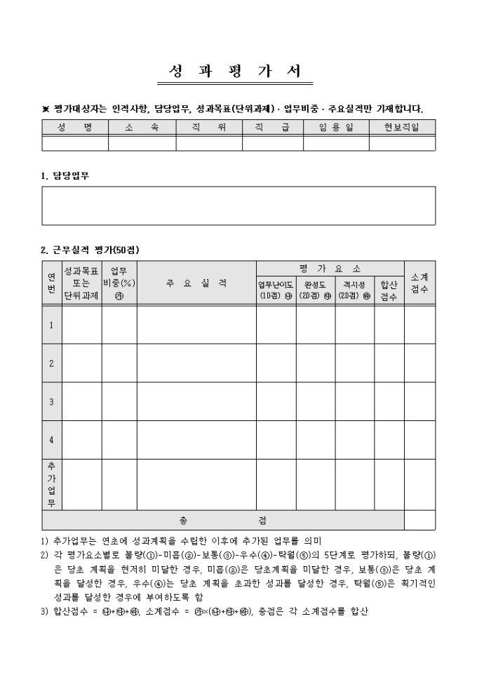 9,000원/월사원의 업무 등 성과에 대한 평가 시 사용할 수 있는 성과평가서입니다. 담당업무, 근무실적 평가, 직무수행능력 평가 등의 항목으로 구성되어있습니다.