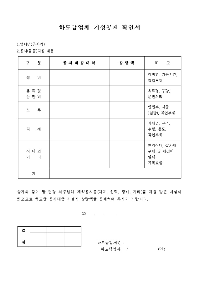 9,000원/월장비, 유류 및 운반비, 노무, 자재 등으로 구분하여 공제대상 내역, 상당액을 기록하는 하도급업체기성공제확인서입니다.