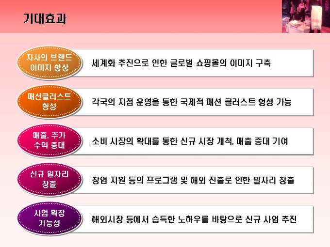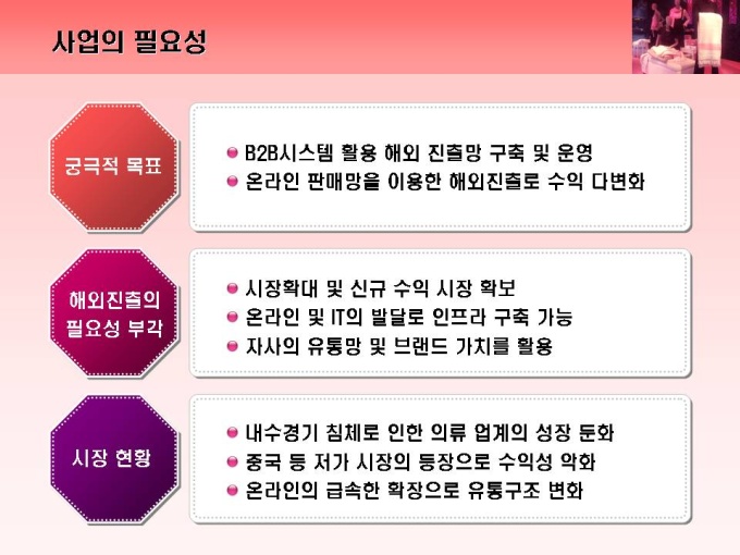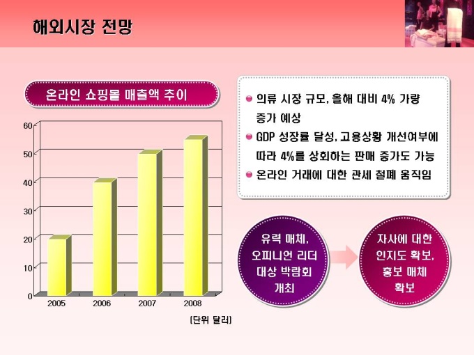 패션쇼핑몰의 해외진출 사업계획서입니다. 목차는 1.시장상황 2.사업내용 3.당해 사업계획 4.사업비 규모로 구성되어있습니다.