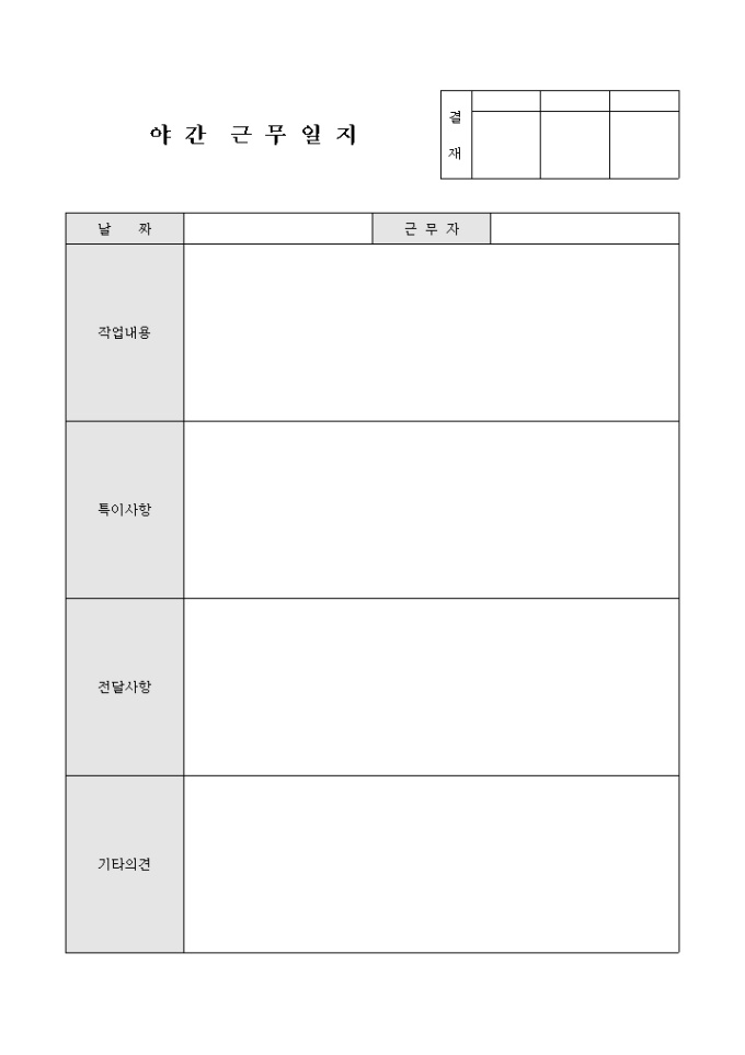 9,000원/월야간근무 시 업무 및 작업 내역 등을 기록/ 관리할 수 있는 야간근무일지입니다. 작업자, 작업내용, 특이사항, 전달사항 등의 항목으로 구성되어있습니다.