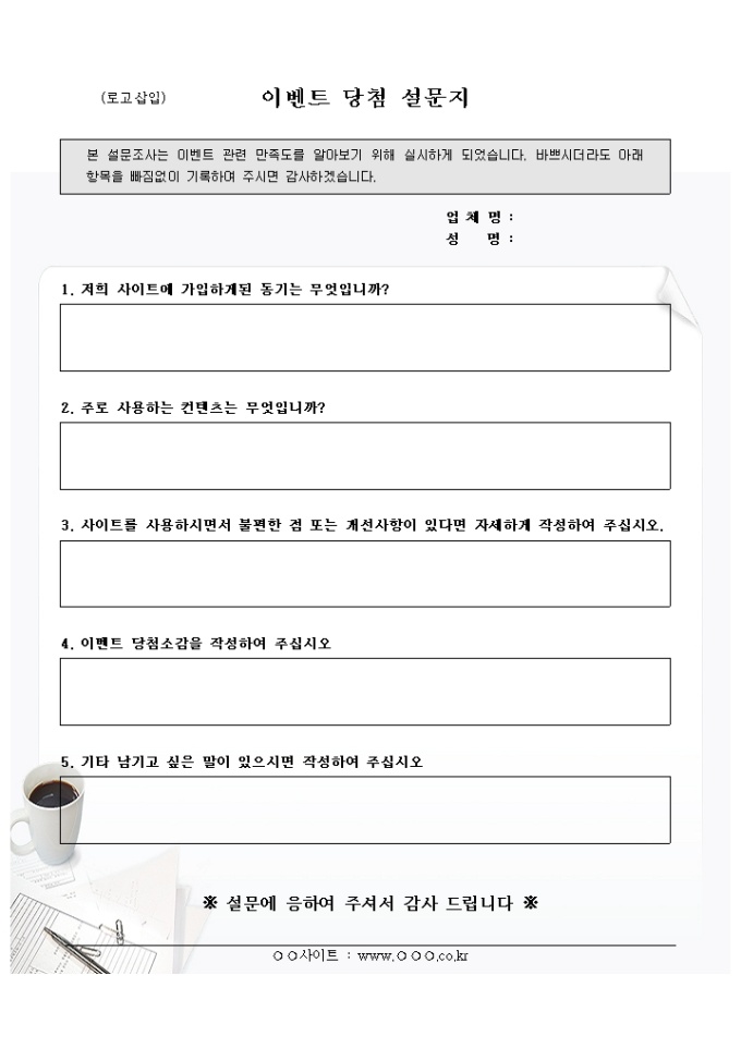 이벤트 당첨자에게 설문을 받을때 사용하는 설문지 서식입니다. 총 5가지의 설문으로 구성되어 배경그림을 포함하여 제작되었습니다.