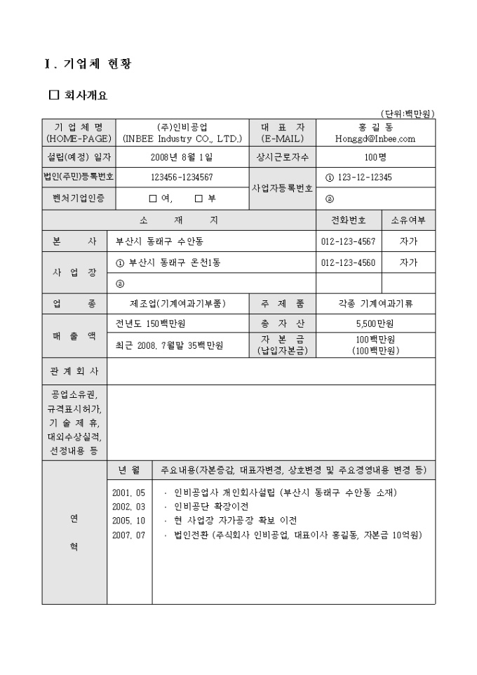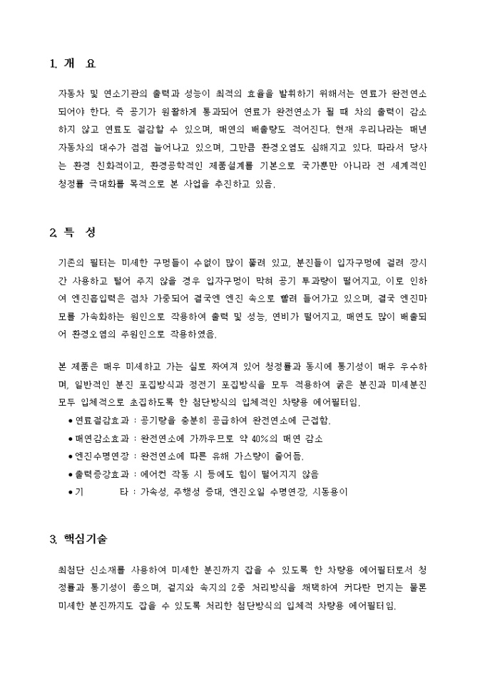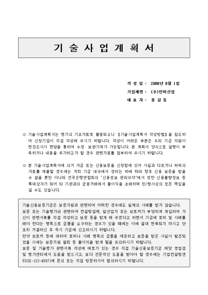 공업기술개발에 대한 사업계획서입니다. 평가의 기초자료로 활용되며 신청기업이 직접 작성하여야 합니다. 샘플이 작성되어 있습니다.