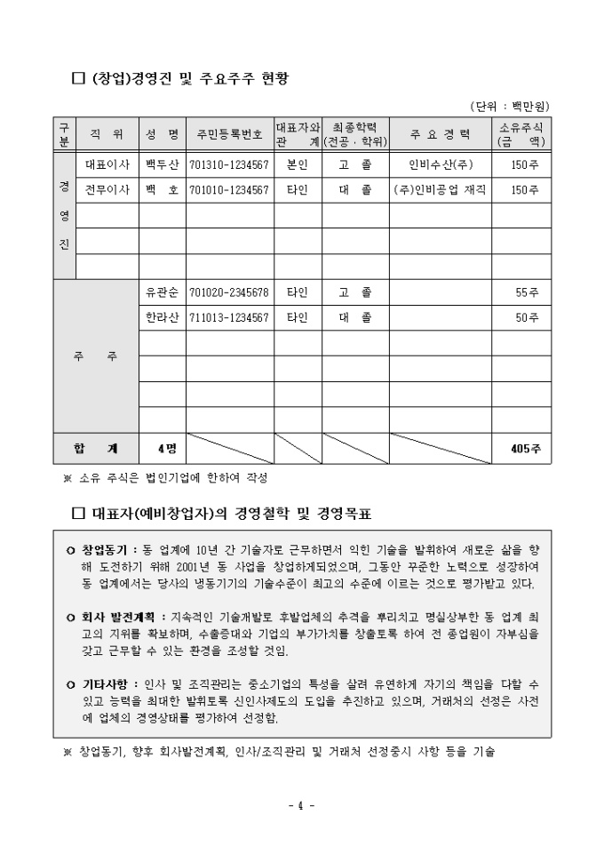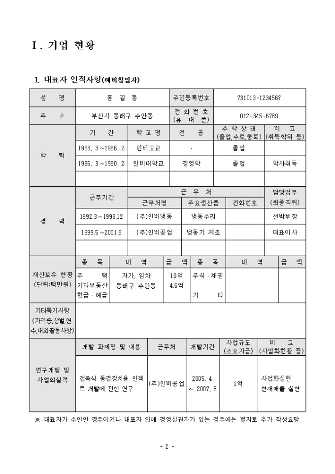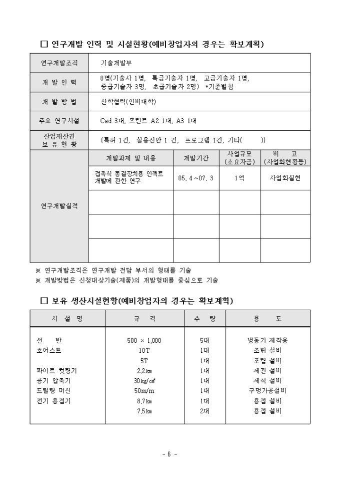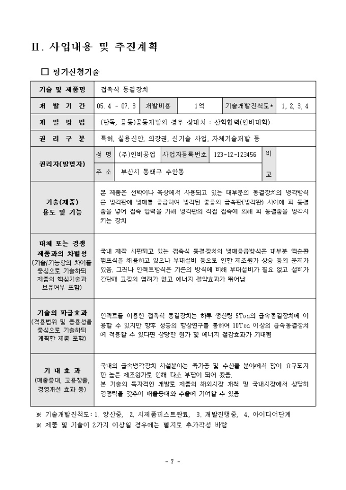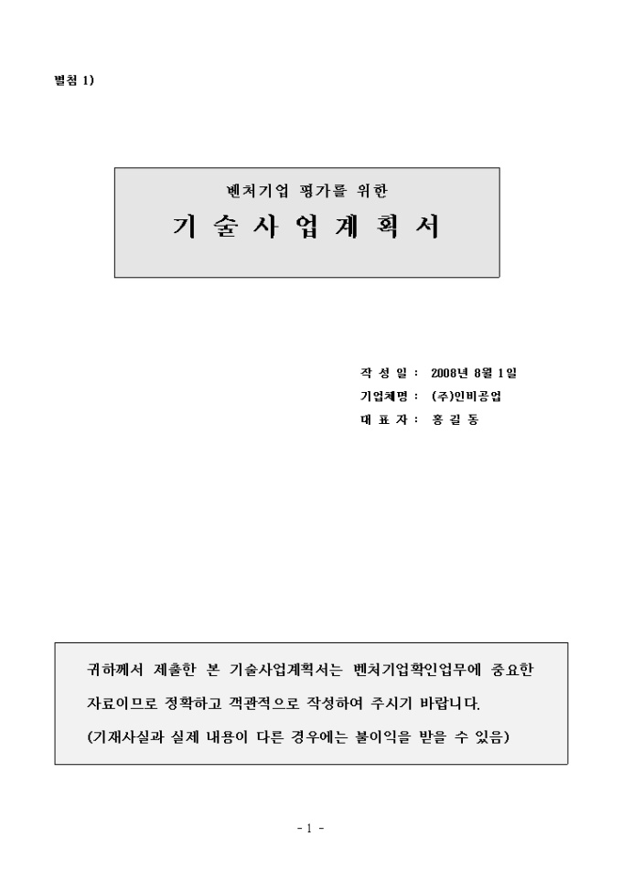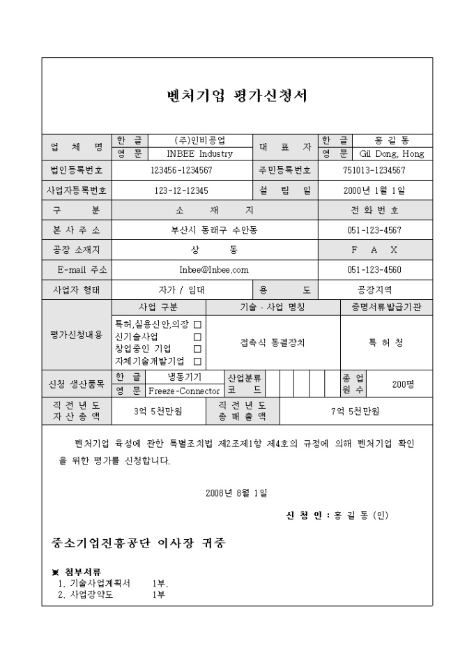 실제 벤처기업 서류심사 시 제출했던 샘플이며, 서류심사 통과 후 벤처인증 성공한 서식예제입니다. 벤처기업 평가신청서 양식과 동결장치에 관련한 기술사업계획서입니다. 벤처기업확인업무에 중요한 자료이므로 정확하고 객관적으로 작성하여야 하며 실제와 내용이 상이할 경우 불이익을 받을 수 있습니다.