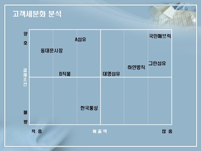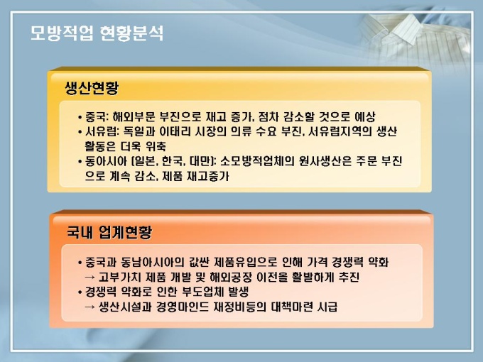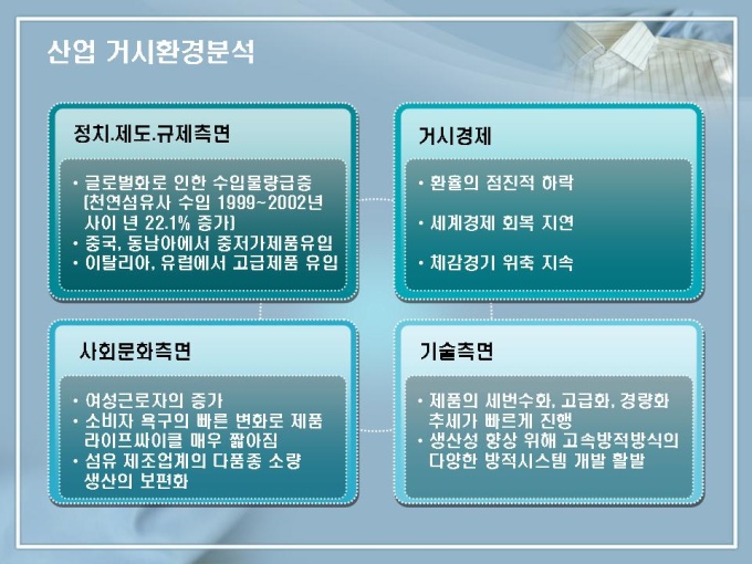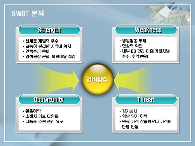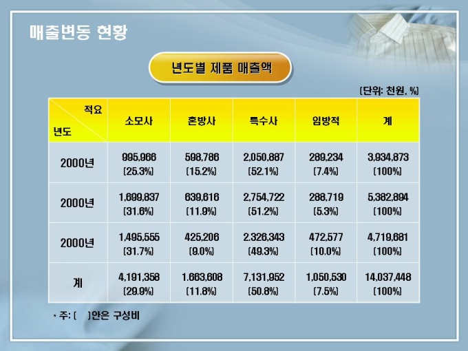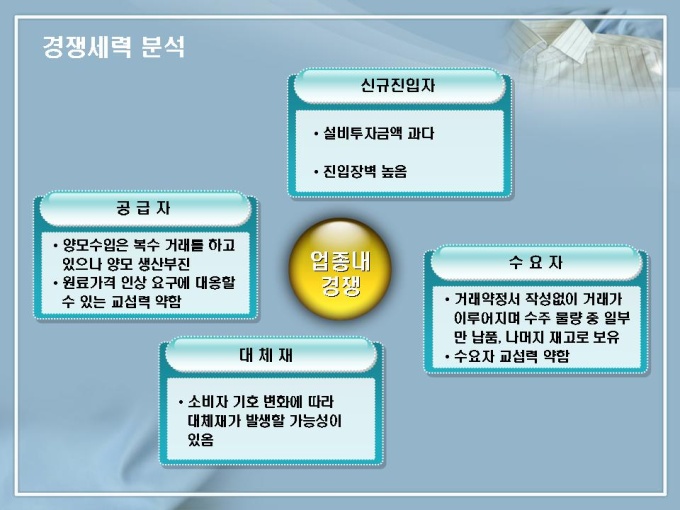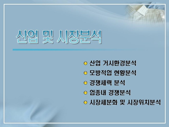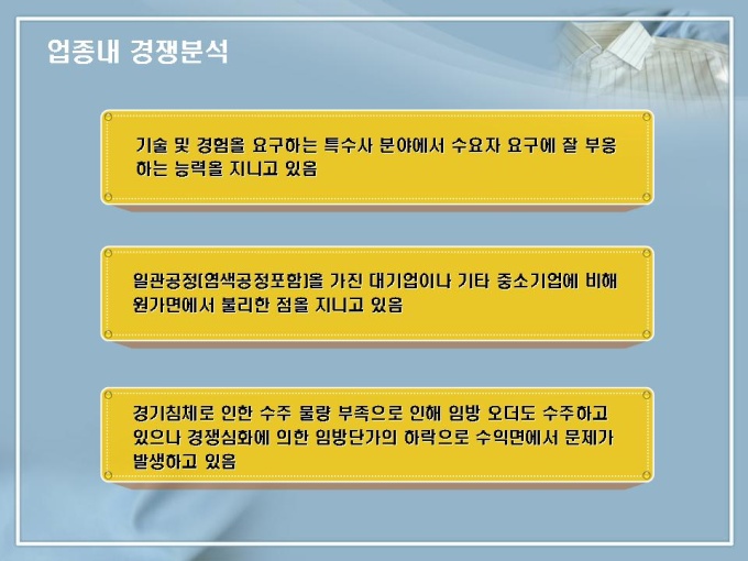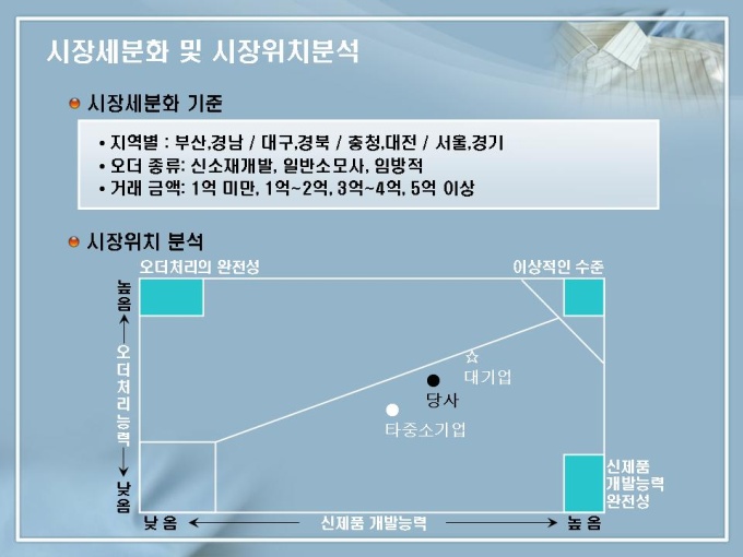 전략수립 사업계획서입니다. 방적, 소모사 제조업체로 목차는 1.회사현황 2.산업 및 시장분석 3.제품 및 고객분석 4. 기업역량 분석 5. 업무이해 및 취약점 6.전략수립 7.실행전략으로 구성되어있습니다.