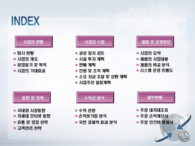 광고물 제작, 제조 사업계획서입니다. 목차는 1.사업현황 2.사업수립 3.제품 및 운영방안 4.동향 및 전략 5.수익성 분석 6.재무현황입니다.