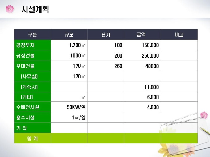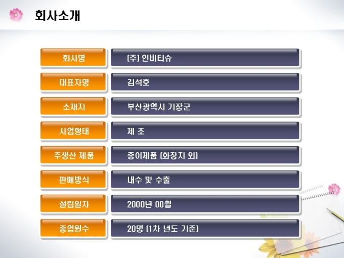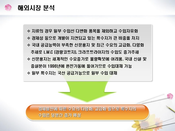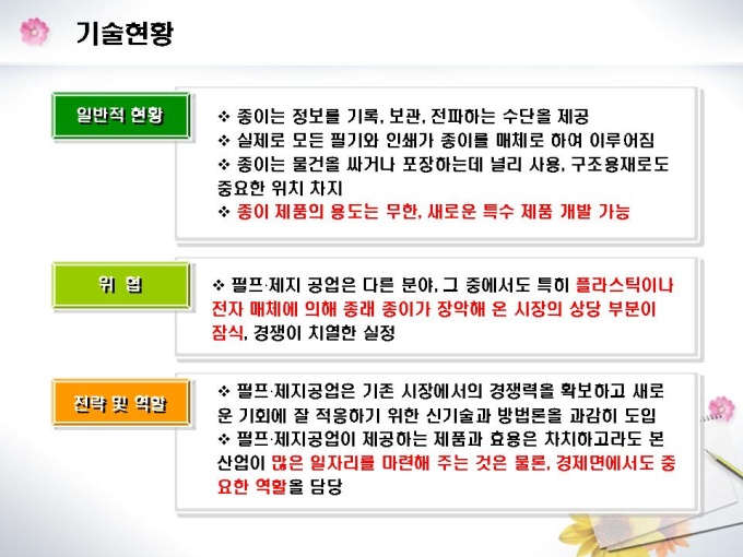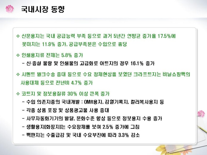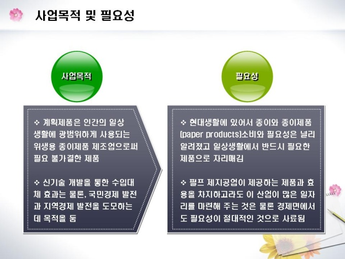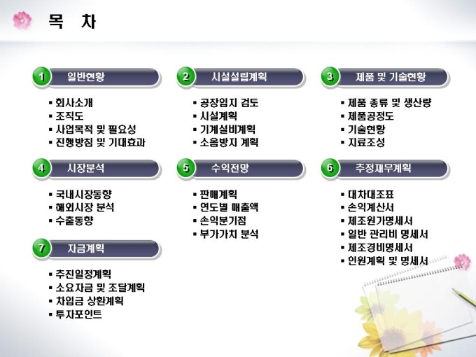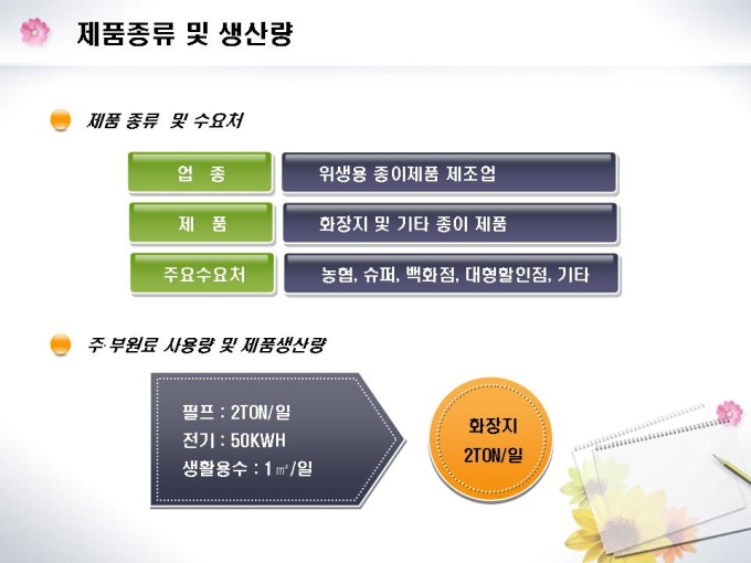 화장지 및 종이제조업체의 창업 사업계획서입니다. 목차는 1.일반현황 2.시설설립계획 3.제품 및 기술현황 4.시장분석 5.수익전망 6.추정재무계획 7.자금계획으로 구성되어있습니다.