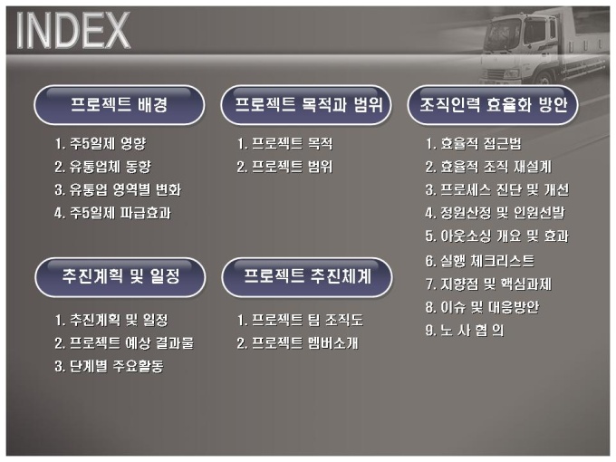 유통업체의 조직관리에 관한 경영컨설팅 보고서입니다. 목차는 1.프로젝트 배경 2.프로젝트 목적과 범위 3.조직인력 효율화 방안 4.추징계획 및 일정 5.프로젝트 추진체계입니다.
