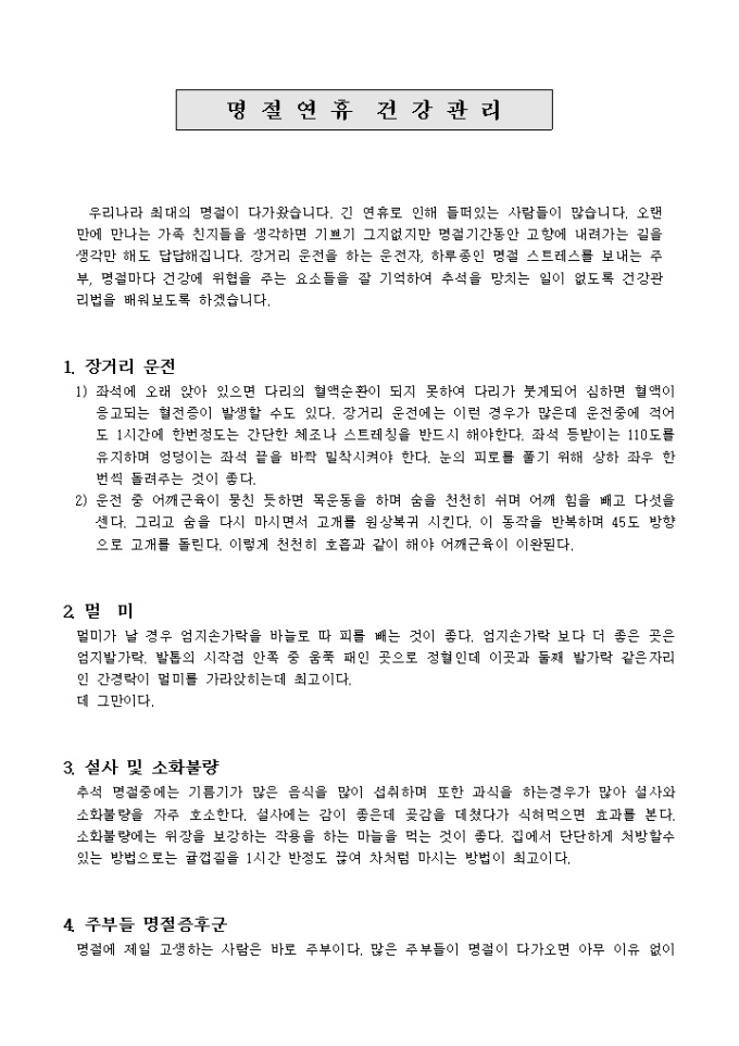 9,000원/월민족 최대의 명절이 눈앞으로 다가왔다. 특히 이번 추석은 긴 연휴로 벌써부터 들떠 있는 사람들이 많다. 오랜만에 옹기종기 모여 앉아 담소를 나눌 가족들을 생각하면 기쁘기 그지없지만 고향에 내려가는 길은 생각만 해도 현기증이 일어난다. 장거리 운전 중 더부룩한 속, 기름진 음식과 명절 스트레스 등이 건강을 위협해 자칫 추석을 망칠 수 있다. 명절 연휴를 즐겁게 보내는 건강관리법을 알아보자.