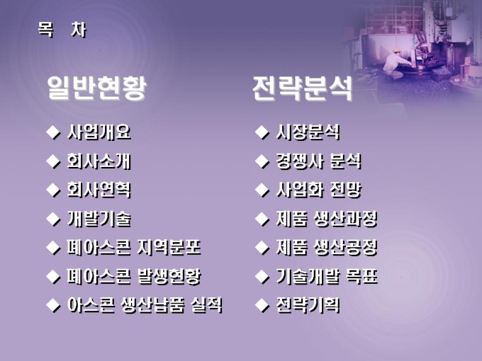 재활용 사업계획서로 재생 아스콘 제조에 관련된 내용입니다. 목차는 일반현황과 전략분석으로 구성되어있습니다.