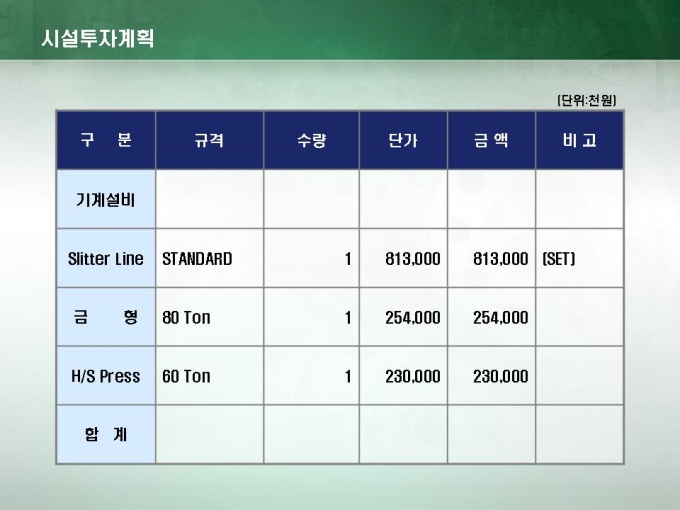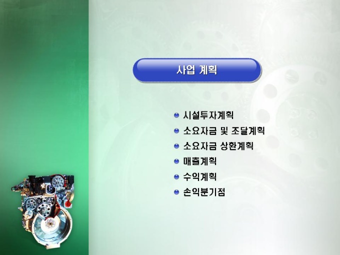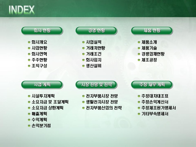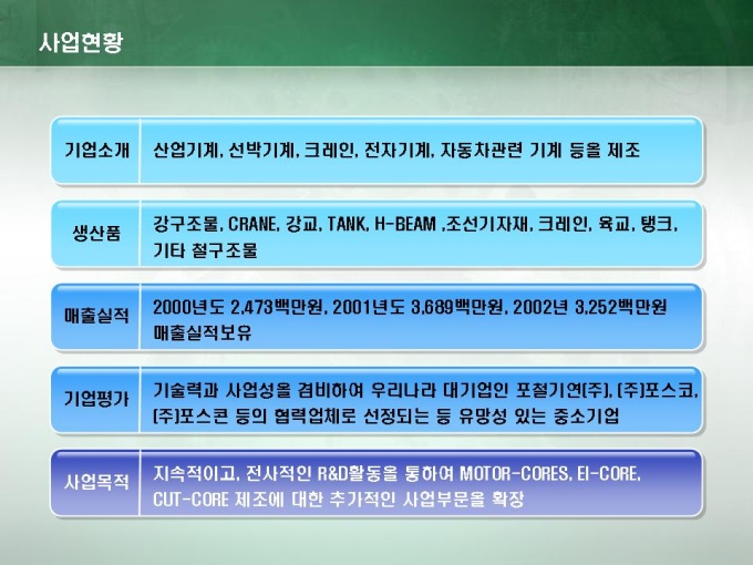 산업기계 제조 사업계획서입니다. 목차는 1.회사현황 2.경영현황 3.제품현황 4.사업계획 5.시장전망 및 전략 6.추정 재무계획으로 구성되어있습니다.
