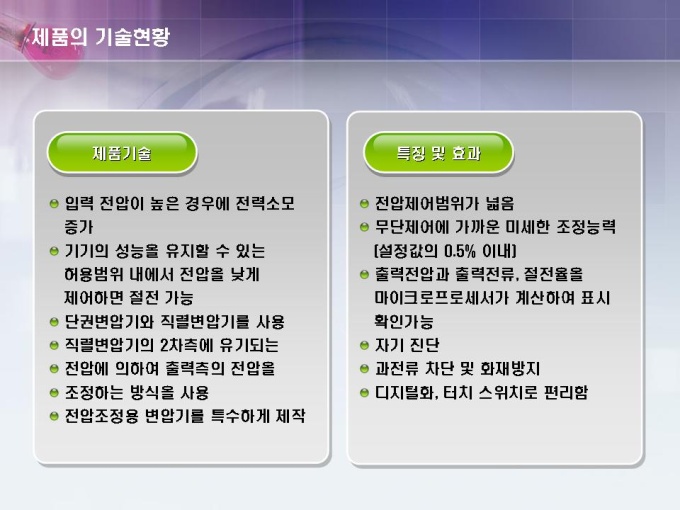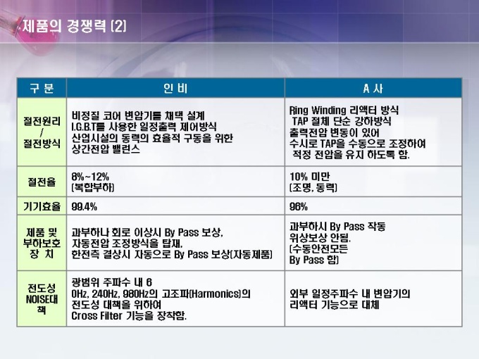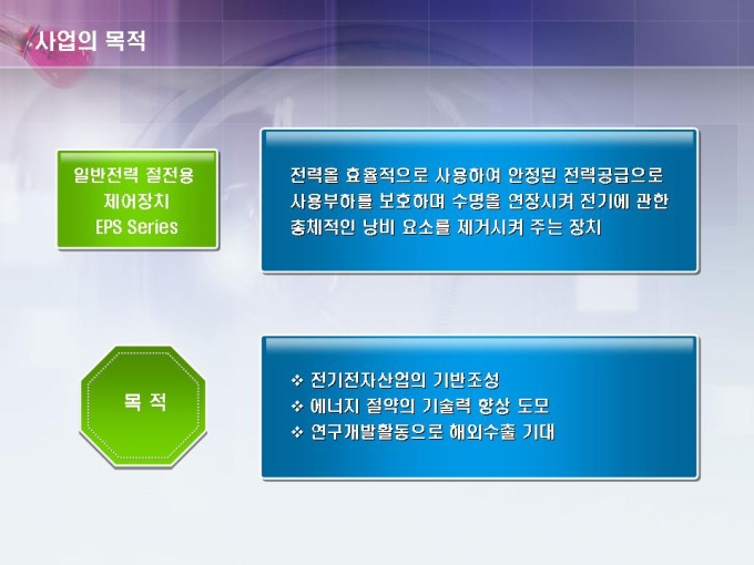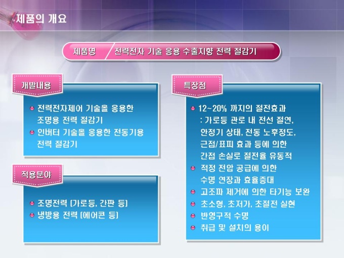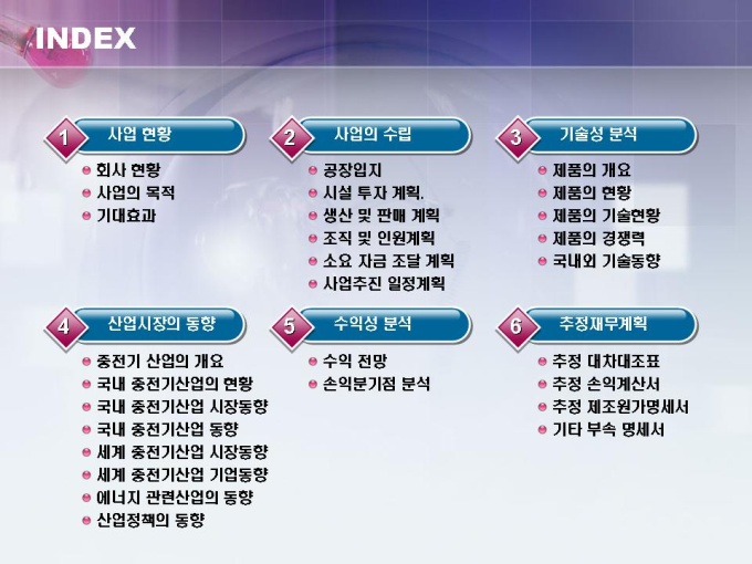 전기절전기, 전력제어장치 제조 사업계획서입니다. 목차는 1.사업현황 2.사업수립 3.기술성 분석 4.산업시장 동향 5.수익성 분석 6.추정 재무계획으로 구성되어있습니다.