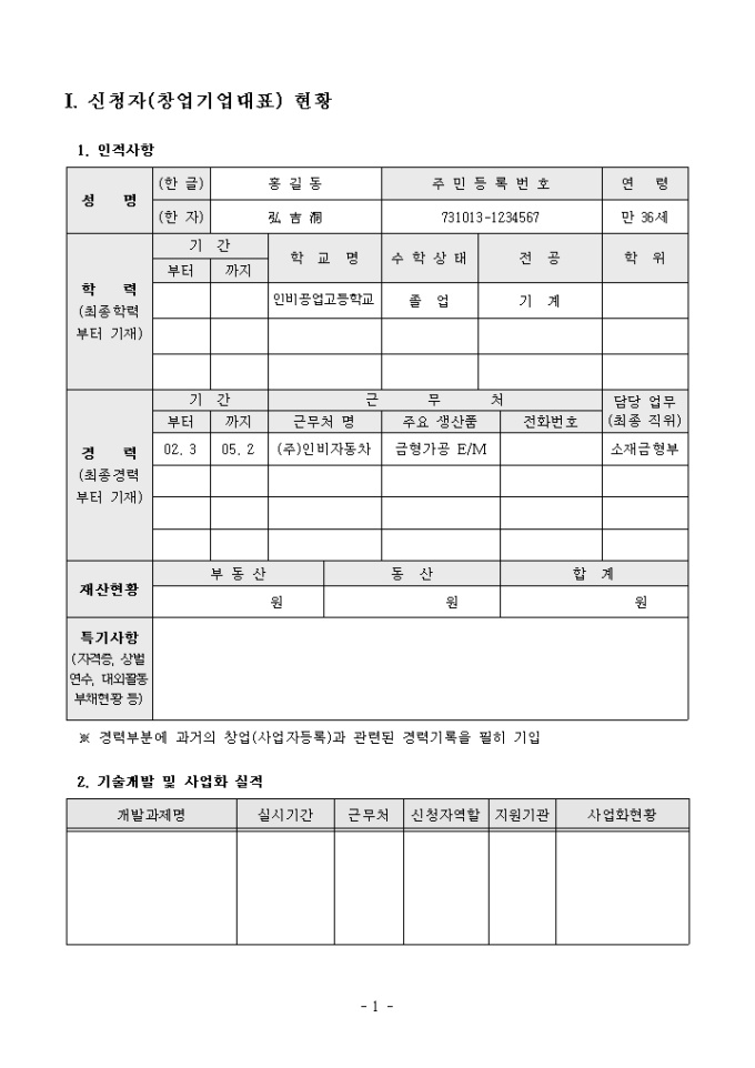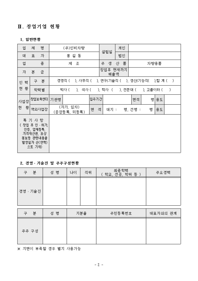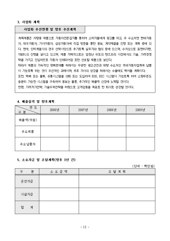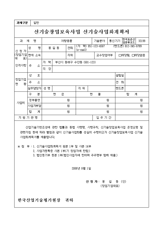 실제 벤처기업 차량용품관련 신기술가업화계획서 샘플이며, 서류심사에 통과한 서식예제입니다. 신청자현황, 창업기업 현황, 신기술사업화 개요, 신기술 사업화 계획 등을 상세하게 작성할 수 있습니다.