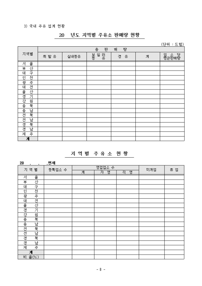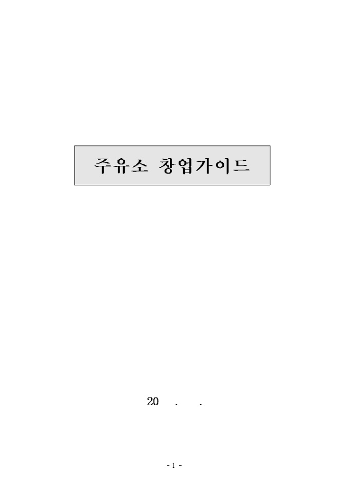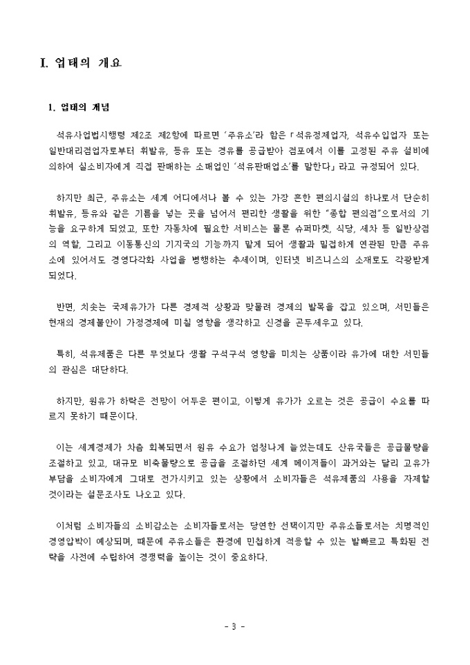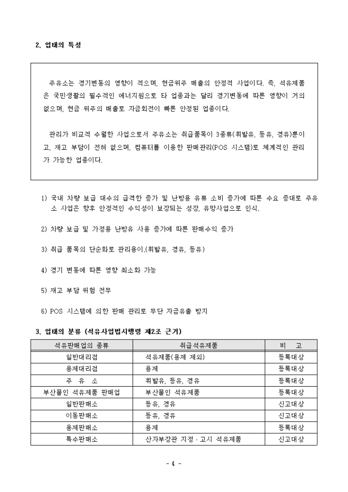 주유소 창업관련 가이드 서식입니다. 업태의 개요, 일반현황, 창업절차, 인/허가사항 및 관련제도 등으로 구성되어 있습니다.