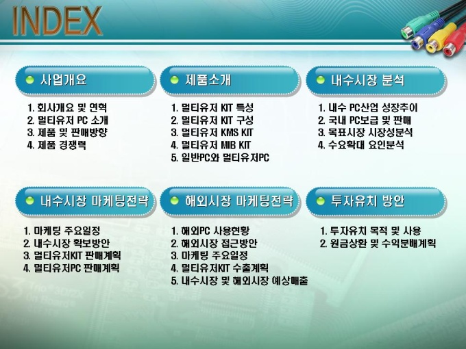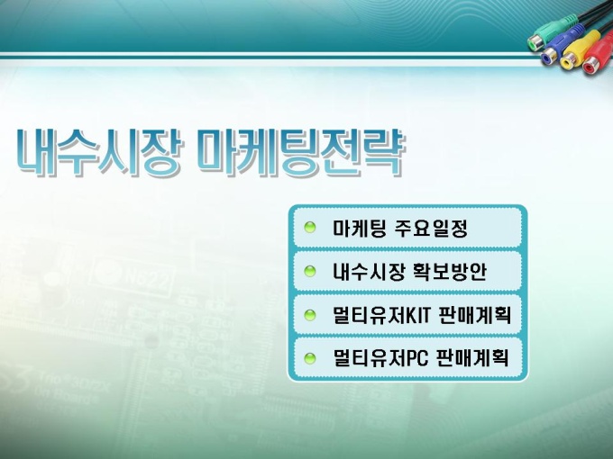 소프트웨어개발 사업계획서입니다. 목차는 1.사업개요 2.제품소개 3.내수시장 분석 4.내수시장 마케팅전략 5.해외시장 마케팅전략 6.투자유치 방안으로 구성되어있습니다.