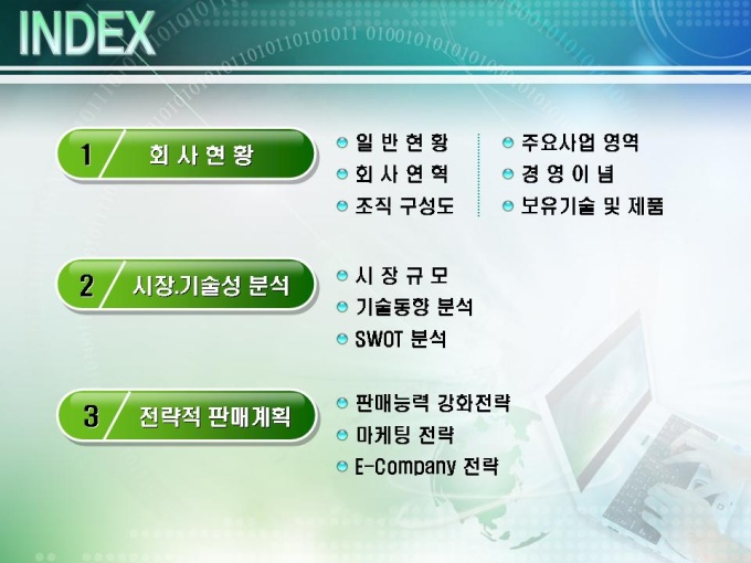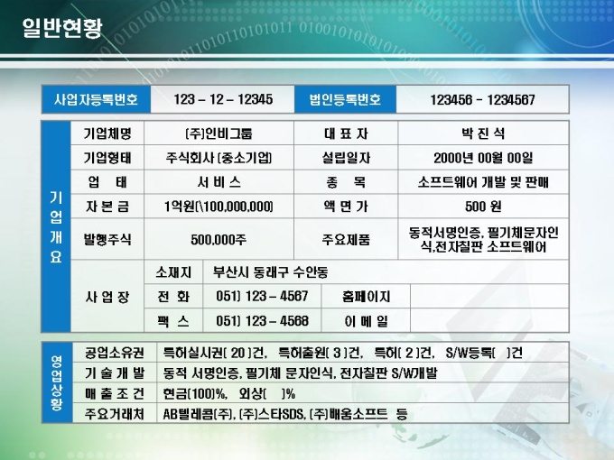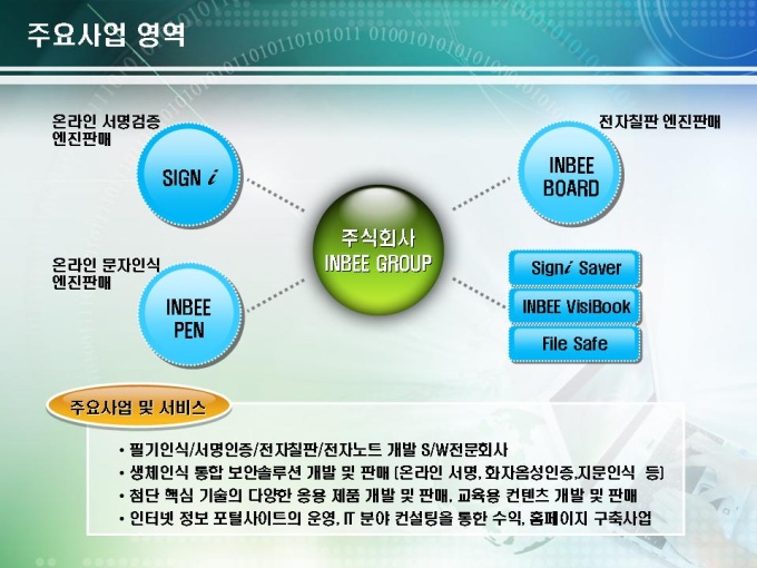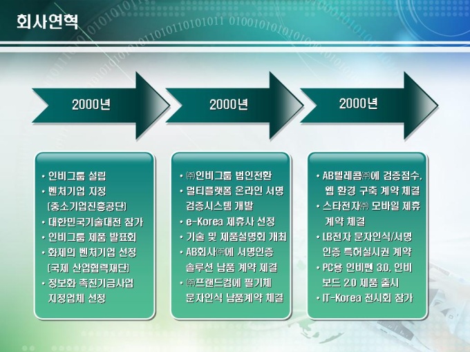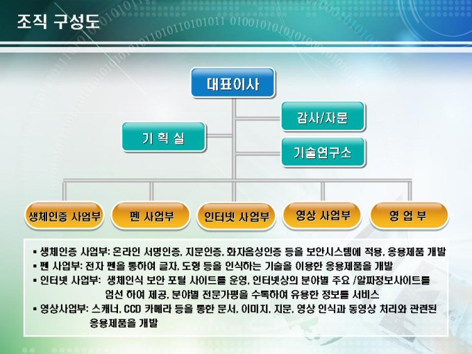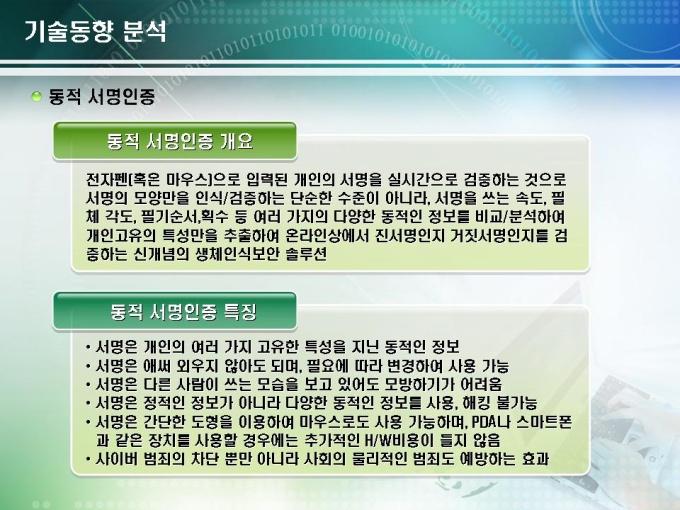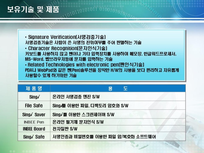 전자기술 사업계획서로 서명인증 솔루션 개발에 관련된 내용입니다. 목차는 1.회사현황 2.시장/기술성 분석 3.전략적 판매계획으로 구성되어있습니다.