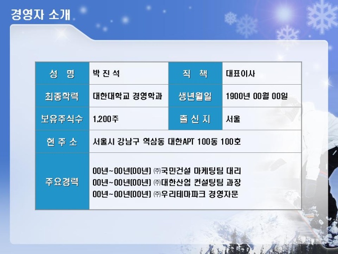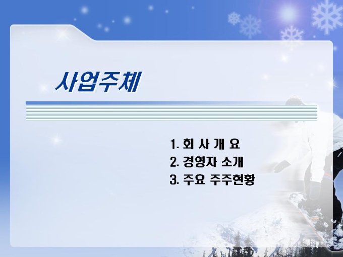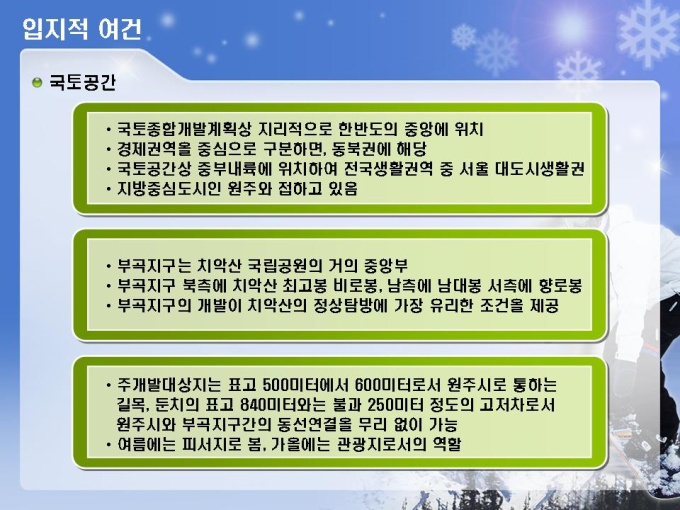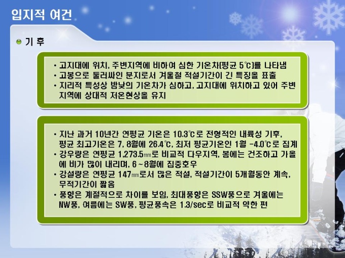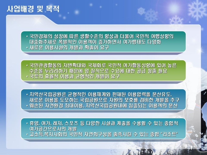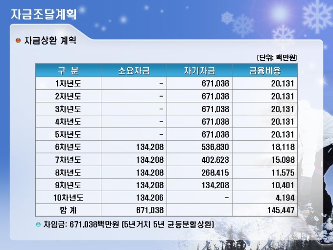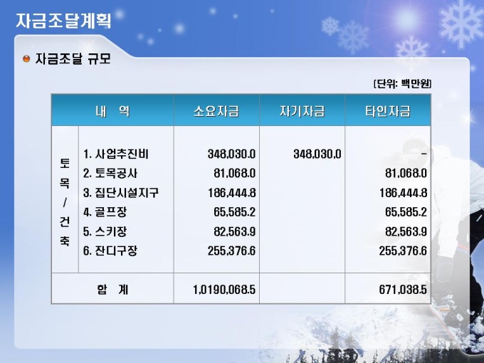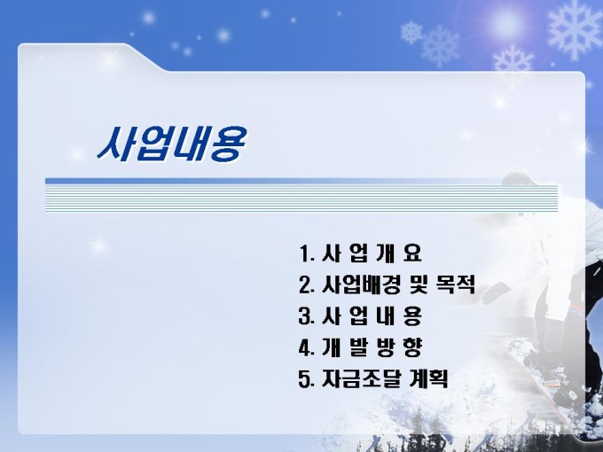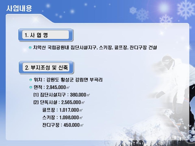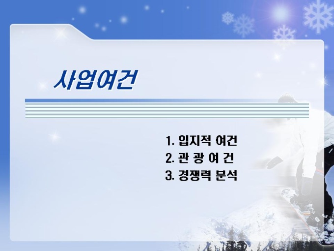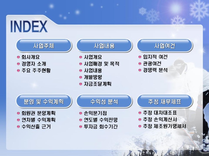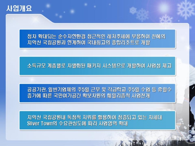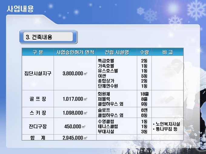 스키장, 스키장, 골프장, 호텔, 유스호스텔 등의 레저단지 사업계획서입니다. 목차는 1.사업주체 2.사업내용 3.사업여건 4.분양 및 수익계획 5.수익성 분석 6.추정 재무제표로 구성되어있습니다.