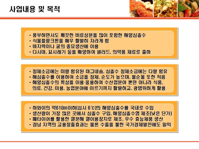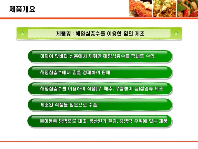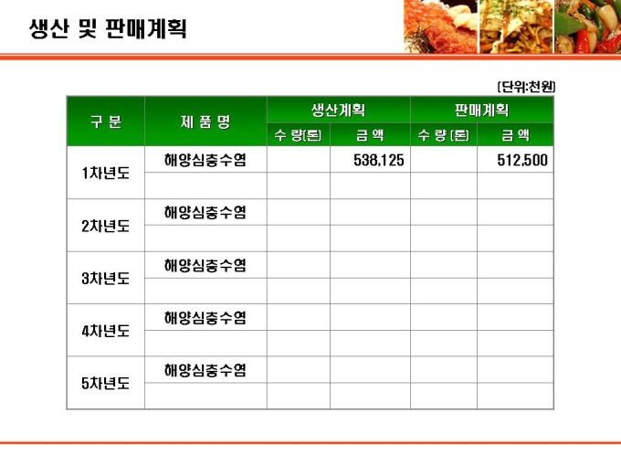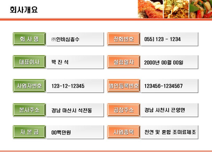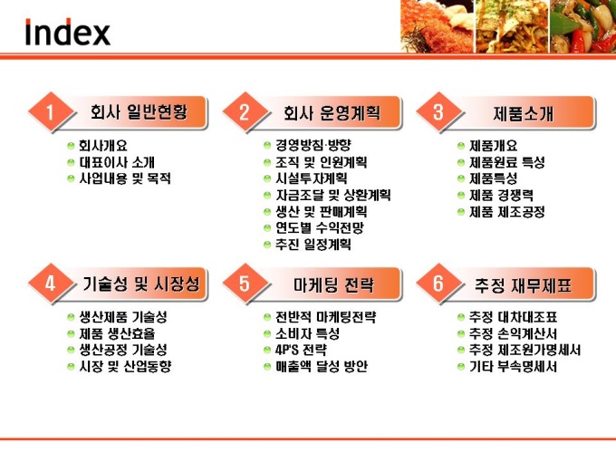 소금, 조미료의 식품제조업체의 사업계획서 샘플입니다. 목차는 1.회사 일반현황 2.회사 운영계획 3.제품소개 4.기술성 및 시장성 5.마케팅 전략 6.추정 재무제표로 구성되어있습니다.