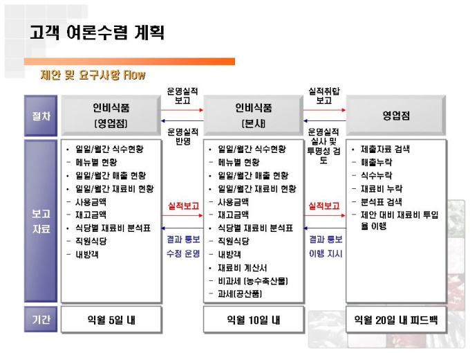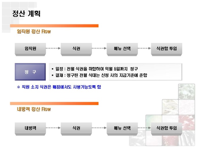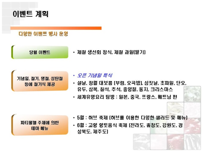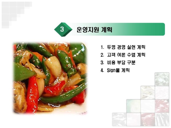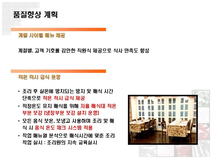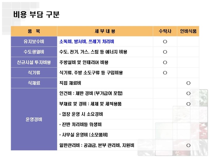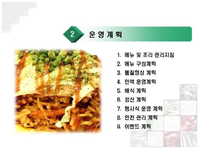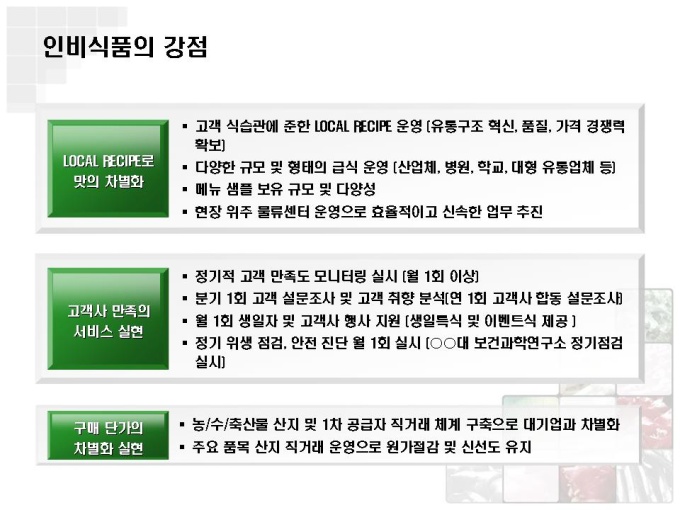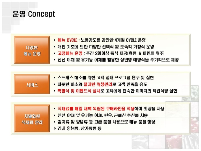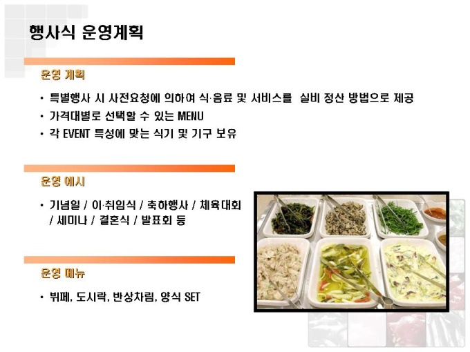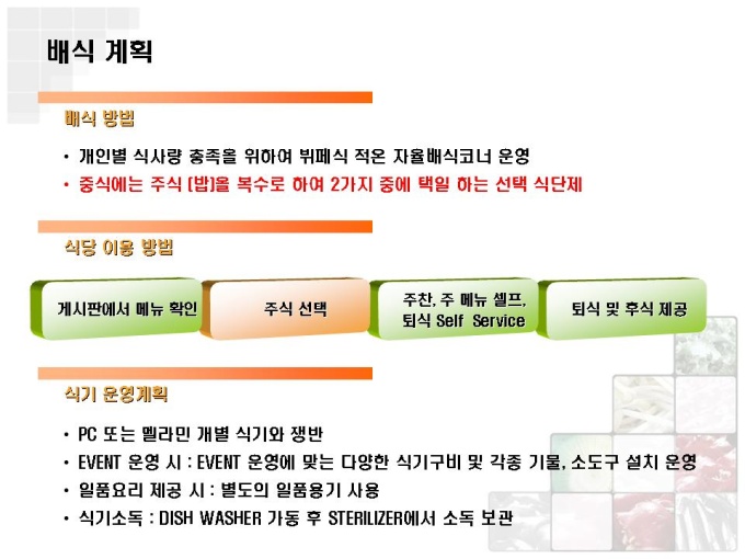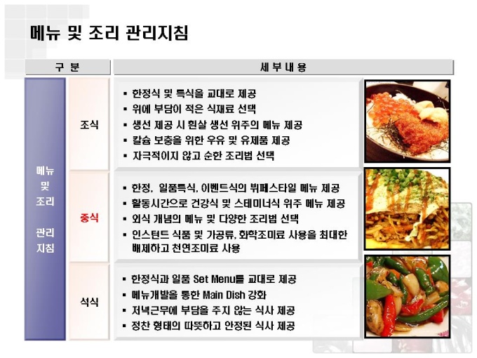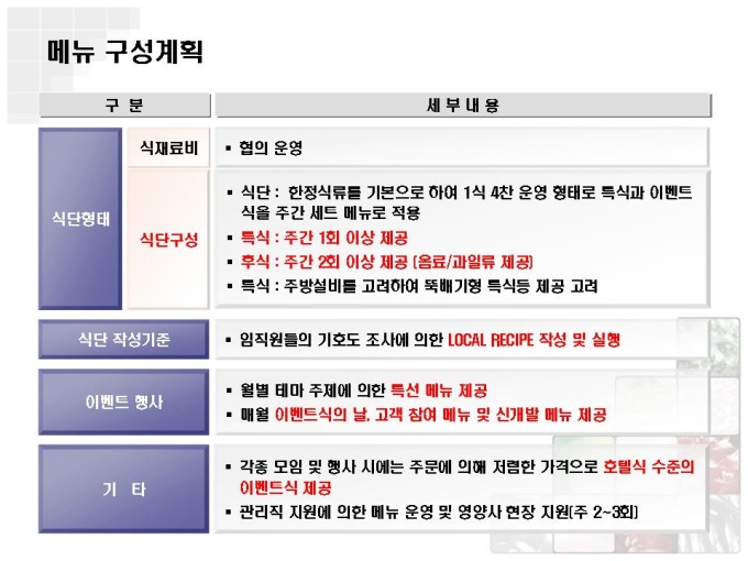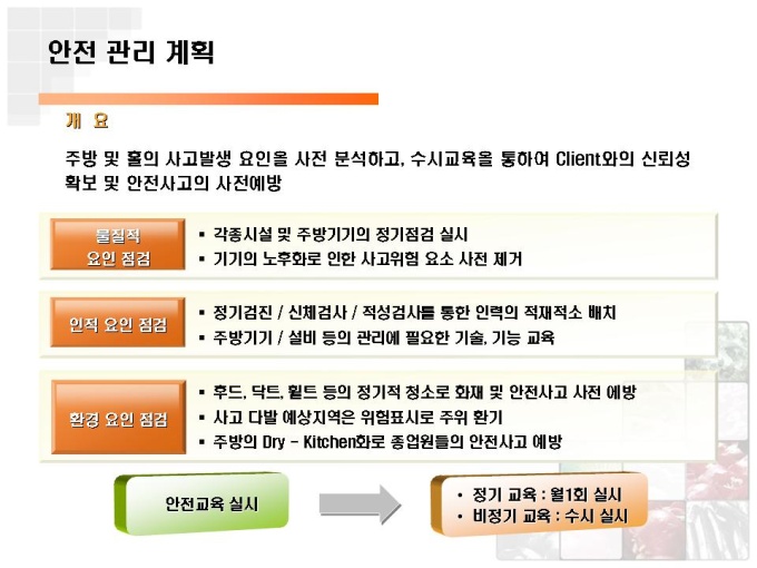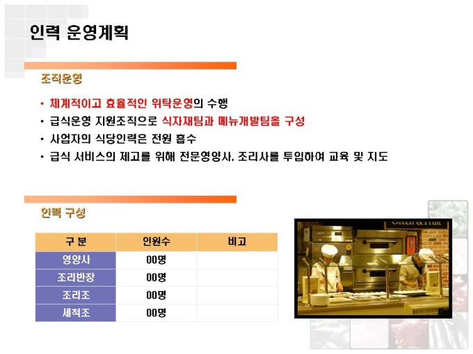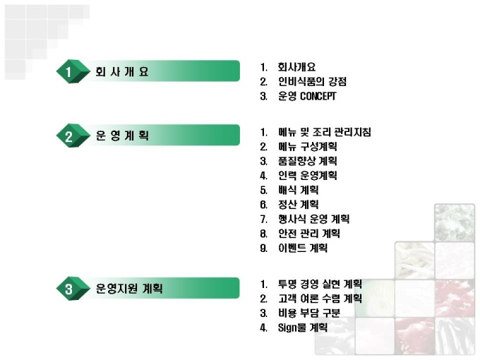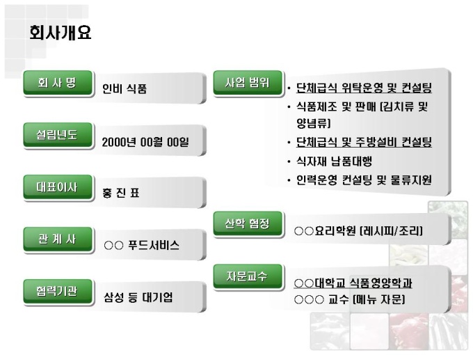단체급식 위탁운영업체 회사소개서, 제안서입니다. 목차는 크게 1.회사개요 2.운영계획 3.운영지원계획으로 구성되어있습니다.