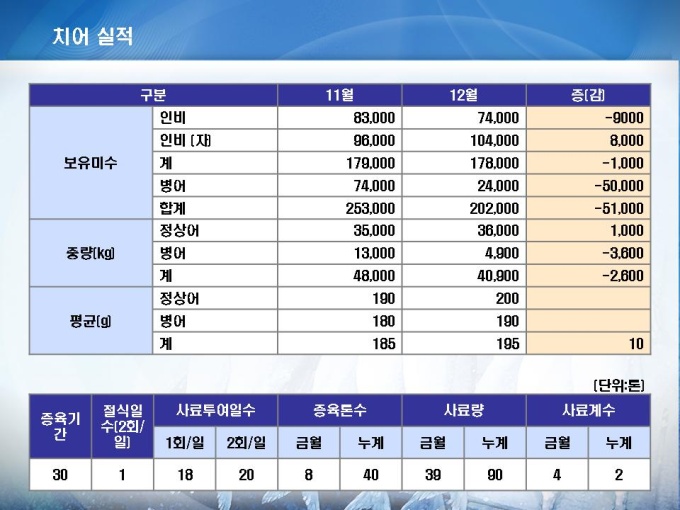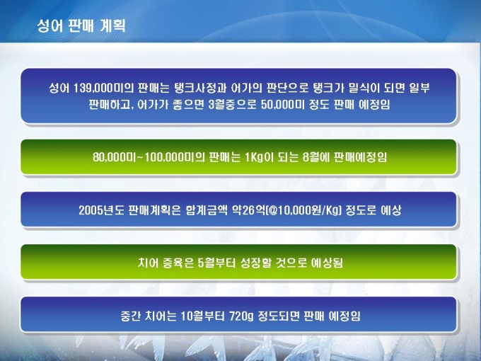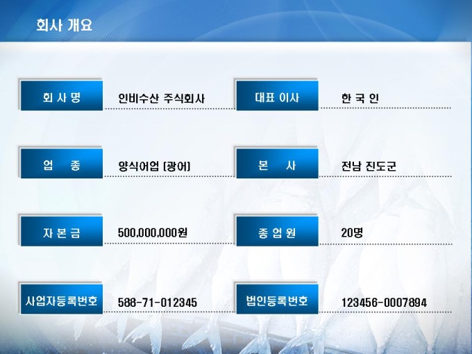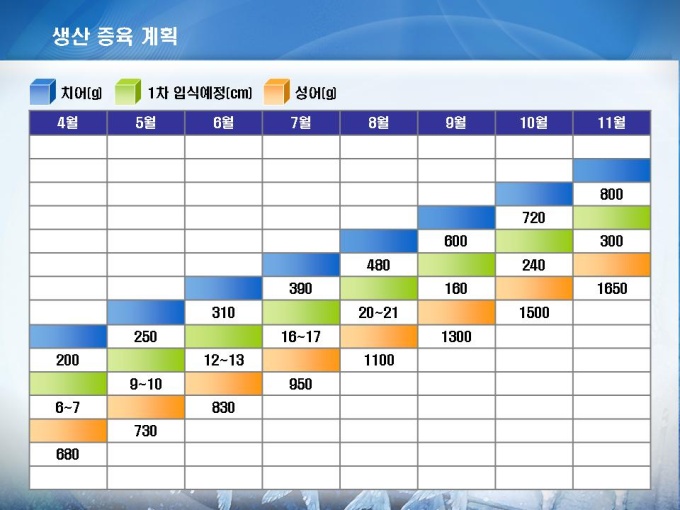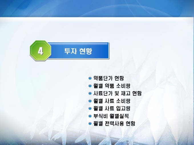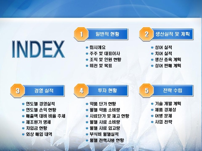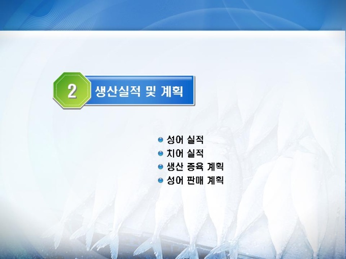 양식어업, 수산업 사업계획서입니다. 목차는 1.일반적 현황 2.생산실적 및 계획 3.경영실적 4.투자현황 5.전략수립으로 구성되어있습니다.
